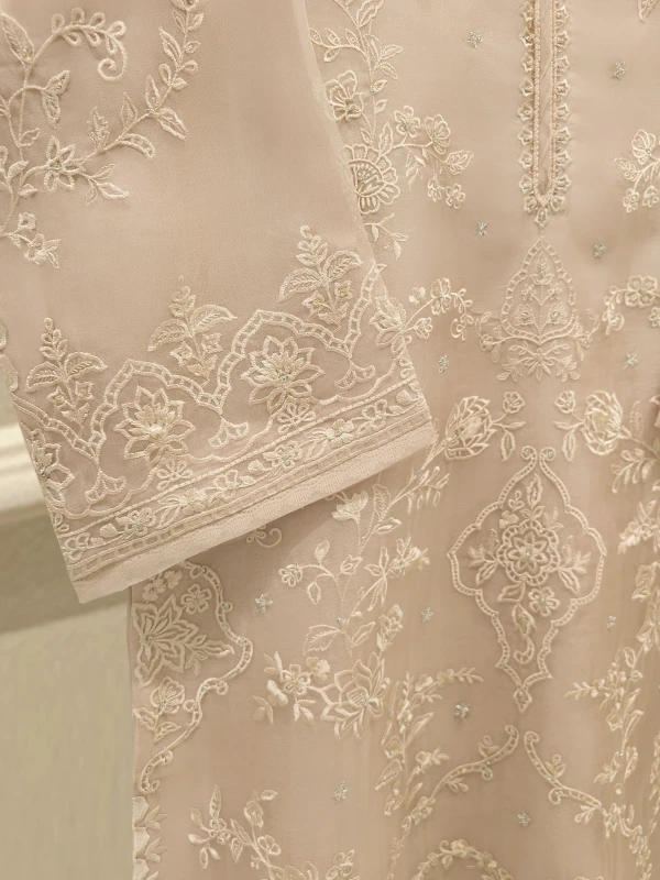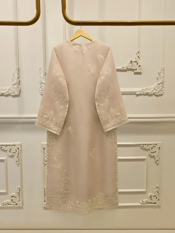 Elevate your style with beige embroidered organza straight shirt crafted with utmost care and attention to detail. The shirt features intricate embroidery on the front and sleeves, adding a touch of timeless charm.