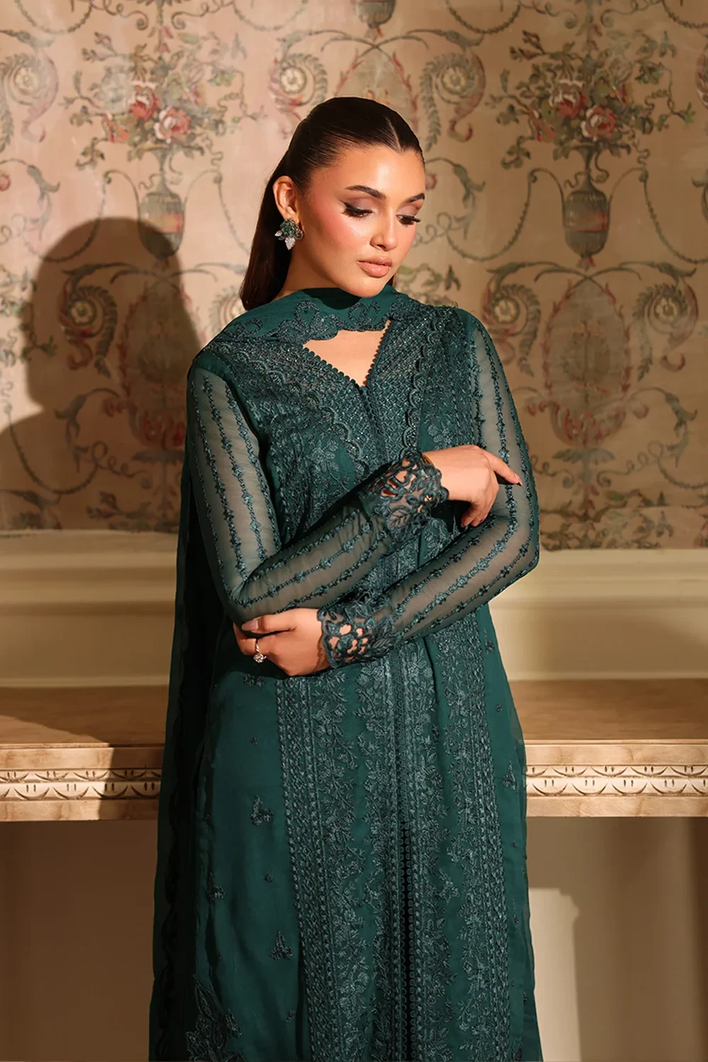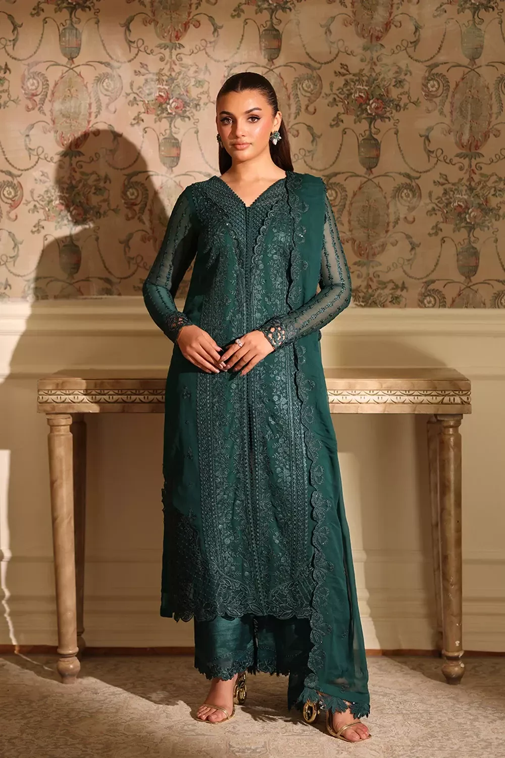 Enchanted Forest – A captivating emerald green chiffon ensemble that beautifully balances elegance with allure. The outfit features a delicately hand-embellished neckline for a touch of luxury, paired with a shimmering sequin embroidered chiffon dupatta. Styled with chic culottes, this ensemble creates a refined yet contemporary silhouette, perfect for festive evenings and special occasions.