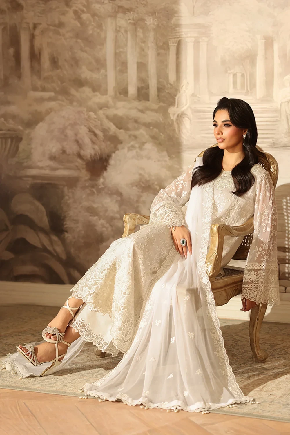 Pearl Whisper – A timeless white chiffon ensemble that radiates understated elegance. The look is elevated with a sequin embroidered chiffon dupatta, adding a subtle sparkle to the outfit, while chic culottes complete the silhouette with a modern edge. Perfectly blending classic charm with contemporary style, Pearl Whisper is a versatile choice for refined occasions.