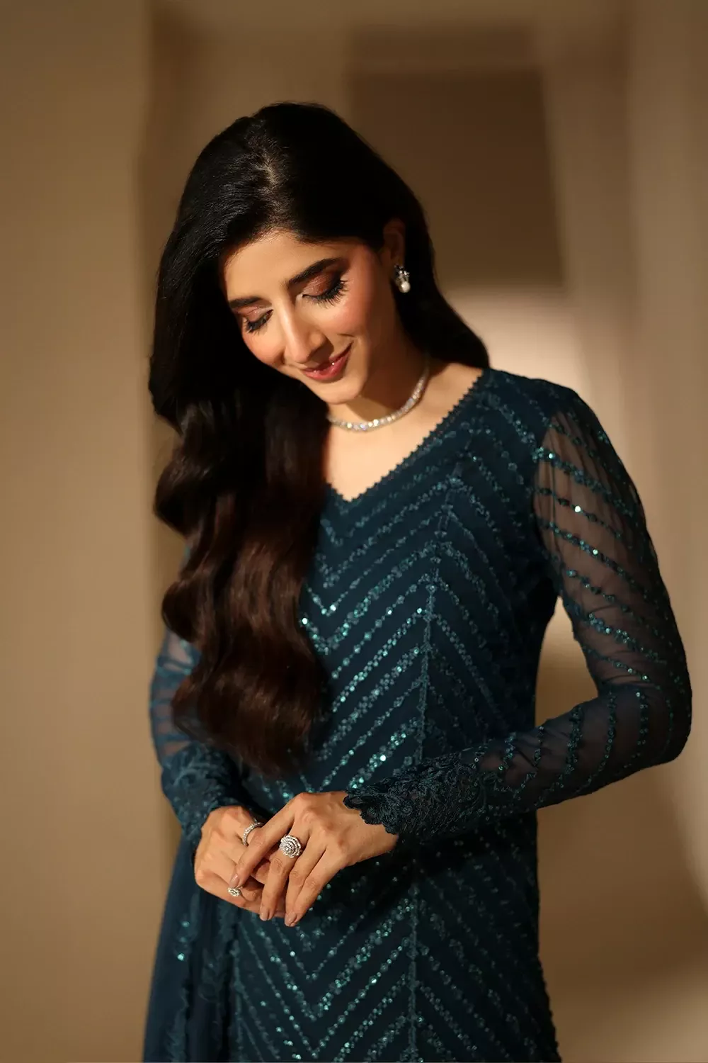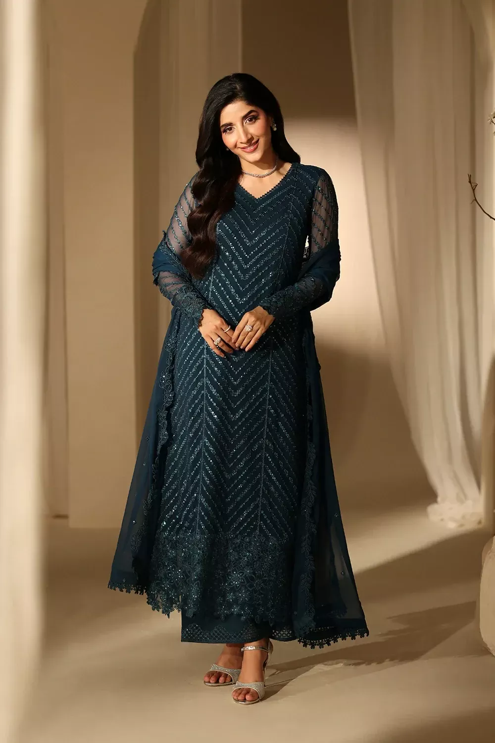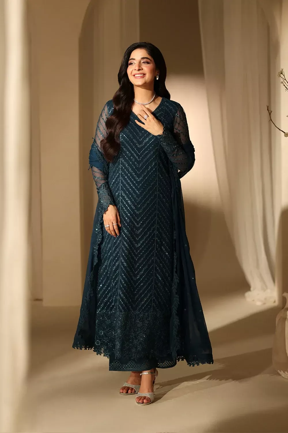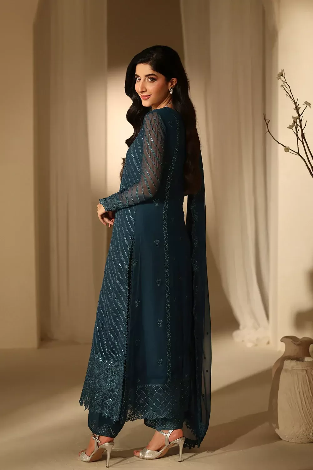 Euphoria is a deep teal three-piece in sequin-embroidered chiffon with organza lace and borders, paired with a matching embellished chiffon dupatta and dyed raw silk trousers for a refined, light-catching look.