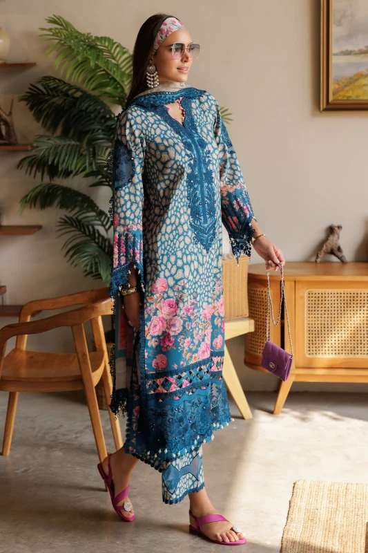 Delicate embroideries bloom across soft, breathable lawn fabric, creating a stunning balance between heritage charm and contemporary grace. The ensemble features exquisite detailing and intricate threadwork, complemented by an elegantly embroidered chiffon dupatta that enhances its refined look.