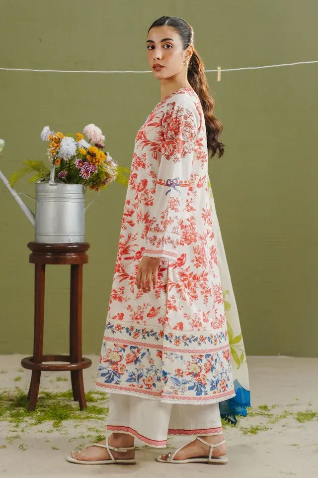 The Dupatta Features A Neatly Arranged Floral Print With A Blue Scalloped Border On Pearl White. The Shirt Carries Cherry Red Floral Prints On A Pearl White Base. The Trouser Is Finished With A Pink Lace Border On Pearl White.