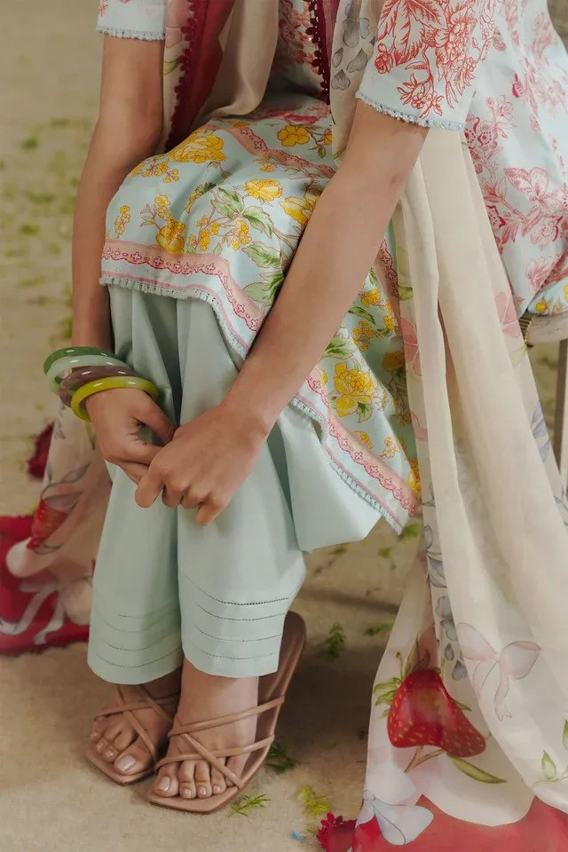 The Dupatta Is Printed With Arranged Florals And Finished With A Red Scalloped Border On Off-white. The Shirt Features Peach And Pink Floral Prints On An Ice Blue Base. The Trouser Is Detailed With A Pink Lace Border On Ice Blue.