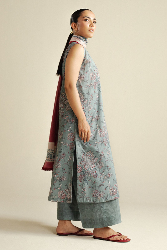 A cool stone blue shirt paired with a printed trouser and a deep red wine dupatta, blending serenity with bold sophistication.