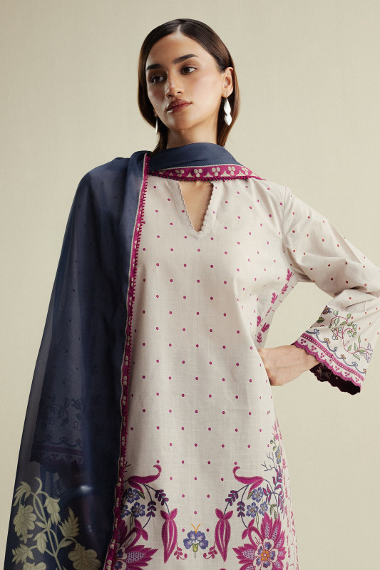 A sand ivory shirt enhanced with intricate plum embroidery, paired with a printed trouser and a blue dupatta that brings a cool, contemporary edge.