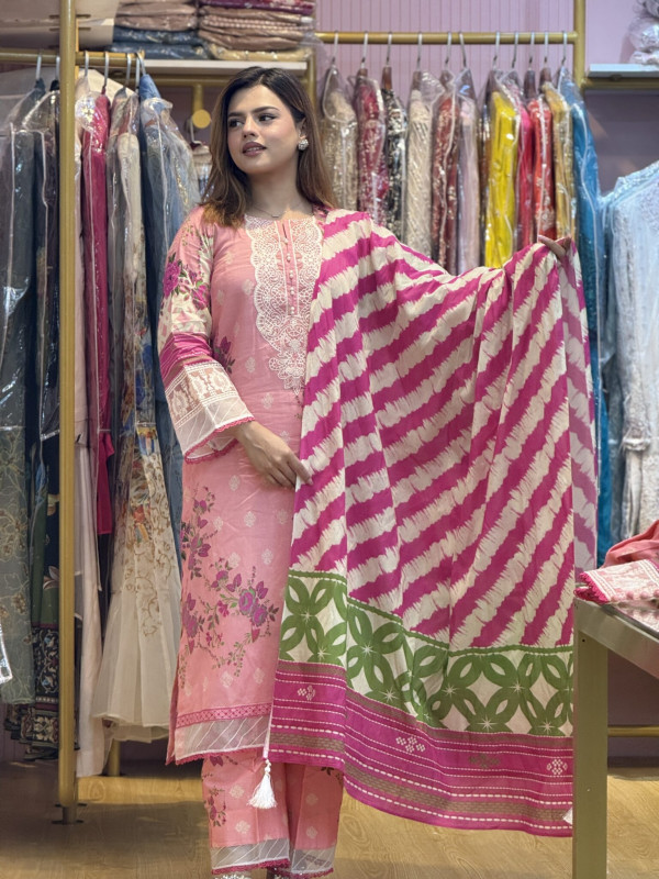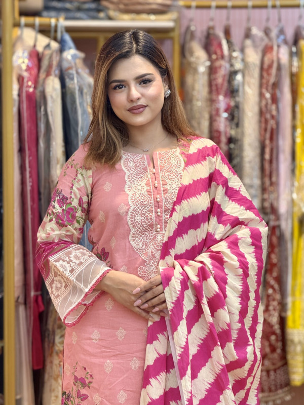Kameez – Floral printed design on the front and sleeves, complemented by a soft light-pink solid panel on the body. Finished with delicate white embroidery work around the neckline.