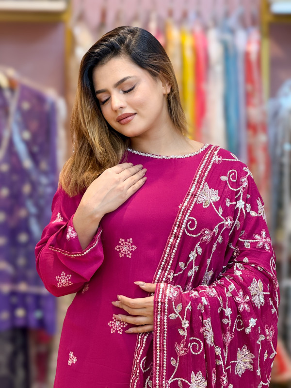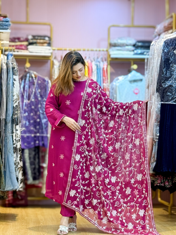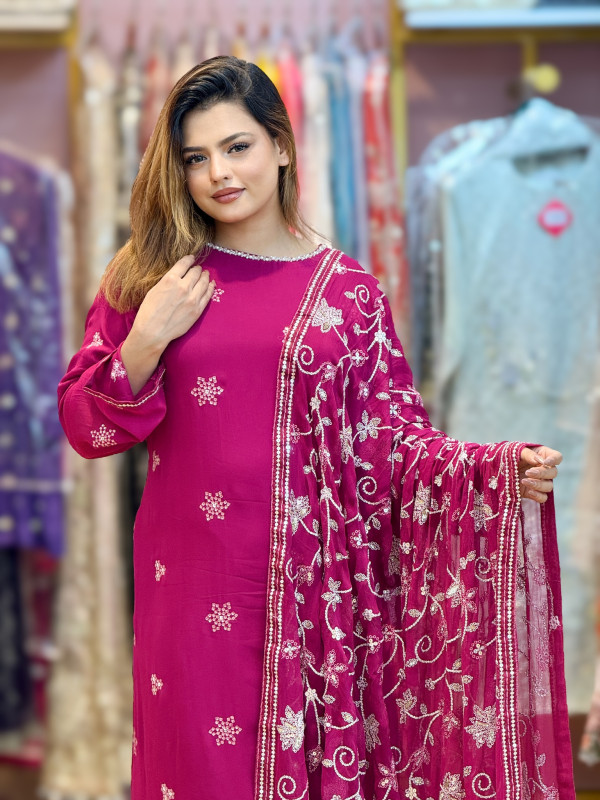Elevate your wardrobe with this exquisite magenta salwar-kameez set, featuring an elegantly embroidered kameez, matching bottom, and a statement dupatta.