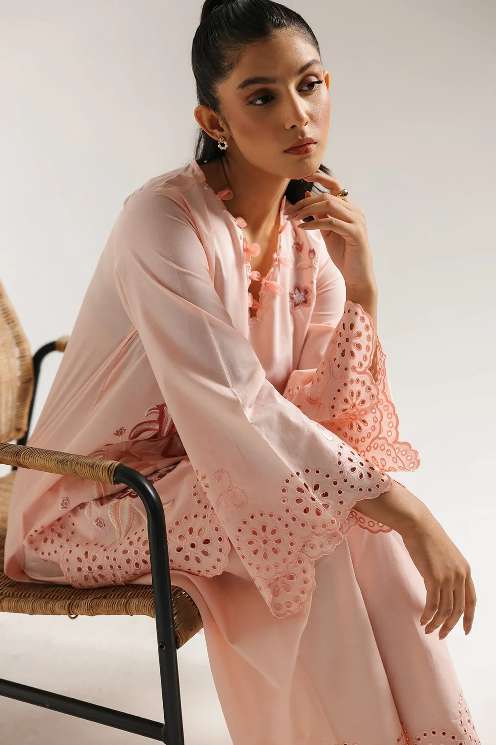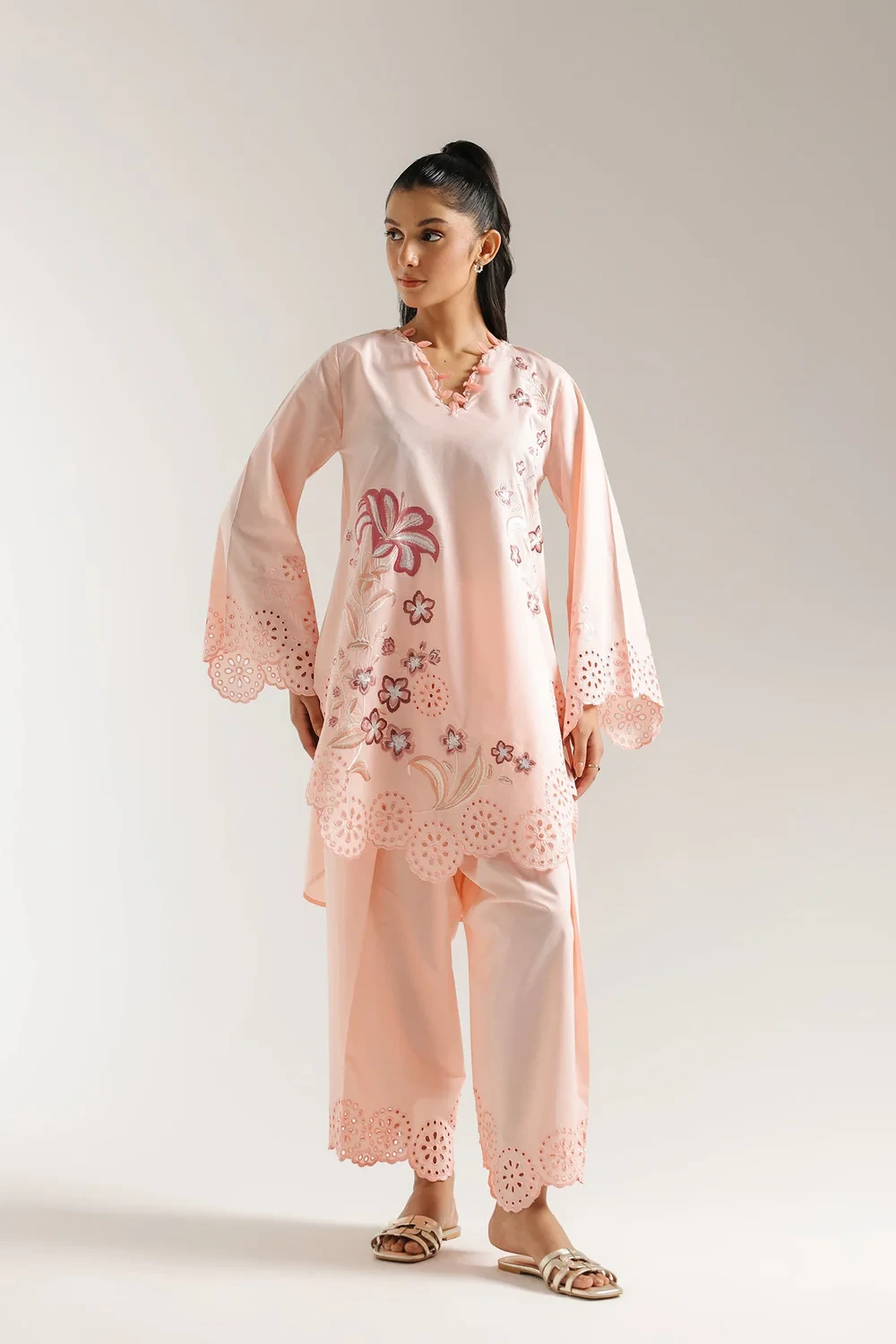 Immerse yourself in delicate beauty with this exquisite two-piece outfit, rendered in a soft, dreamy shade of peach. The enchanting kurta features a graceful V-neckline with subtle detailing, while its flowing bell sleeves and elegant hem are adorned with intricate floral cutwork and charming scattered embroidery. This ethereal top is perfectly complemented by matching straight shalwar, which echo the stunning scalloped cutwork at the hem, creating a harmonious and sophisticated look. Crafted for supreme comfort and undeniable elegance, this ensemble is an ideal choice for graceful daytime events, intimate gatherings, or any occasion where you wish to radiate soft, captivating charm.