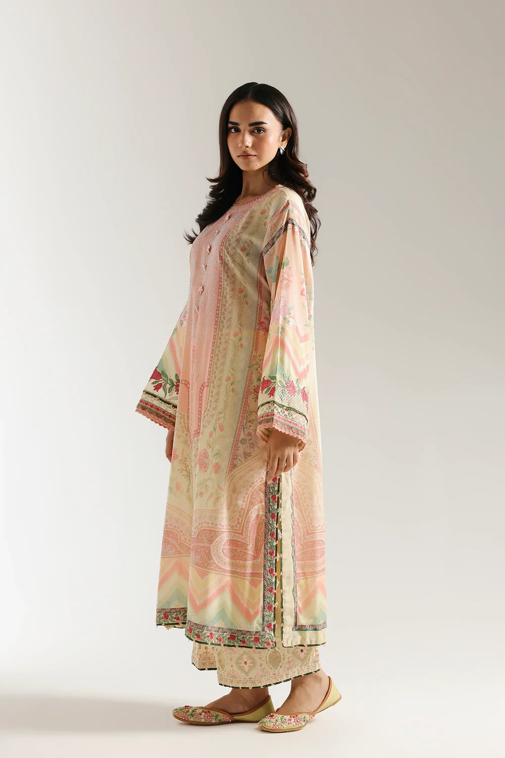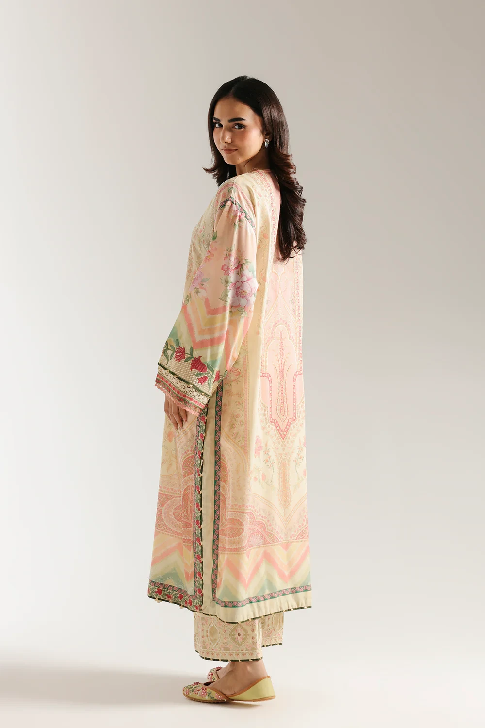 This artistic embroidered suit is a masterpiece of color and pattern. The long kurta is a stunning blend of printed motifs and intricate embellishments in a beautiful palette of pastel shades. The detailing around the neckline and on the sleeves gives the piece a graceful texture, perfectly complemented by the coordinating trouser with its delicate embroidered hem.