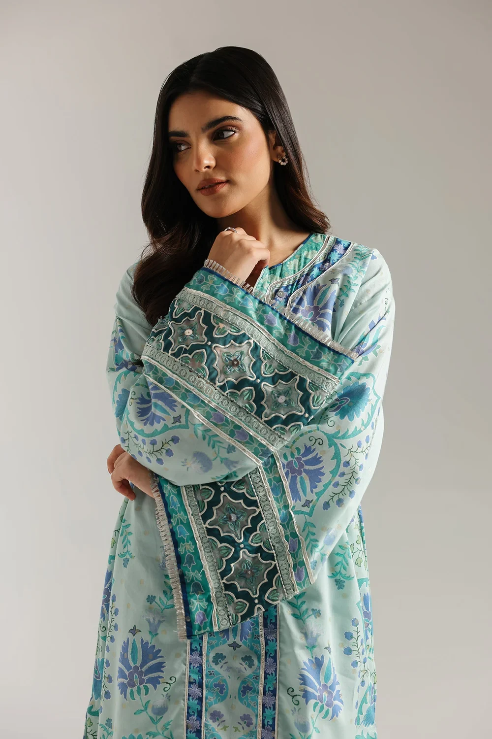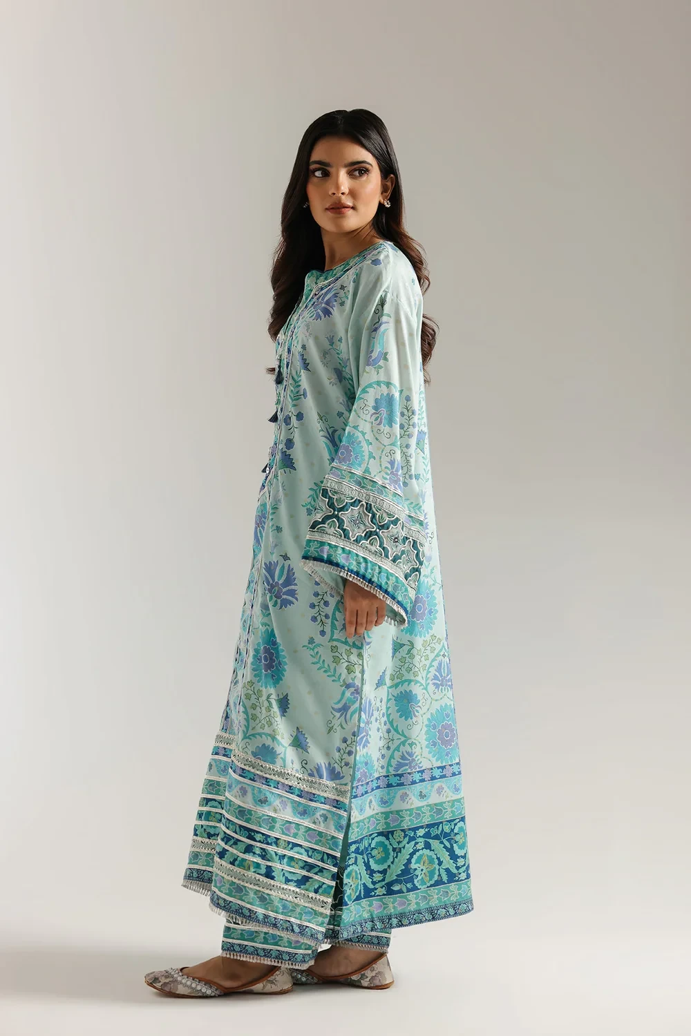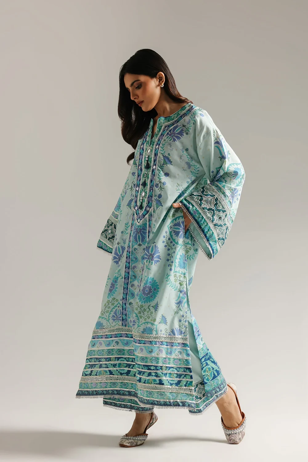 Dive into a world of serene elegance with this breathtaking suit, a masterpiece of intricate artistry. The long, flowing shirt is a canvas of tranquil aqua, adorned with a mesmerizing symphony of floral and ornamental patterns in rich blues, purples, and greens. The round neckline is beautifully highlighted by intricate gotta detailing placket, while the wide, bell-shaped sleeves and hem feature coordinating, ornate borders. This stunning ensemble is the epitome of sophisticated style and graceful design.