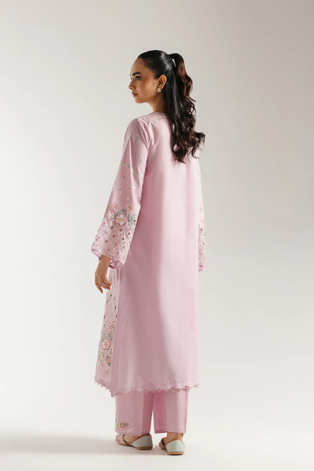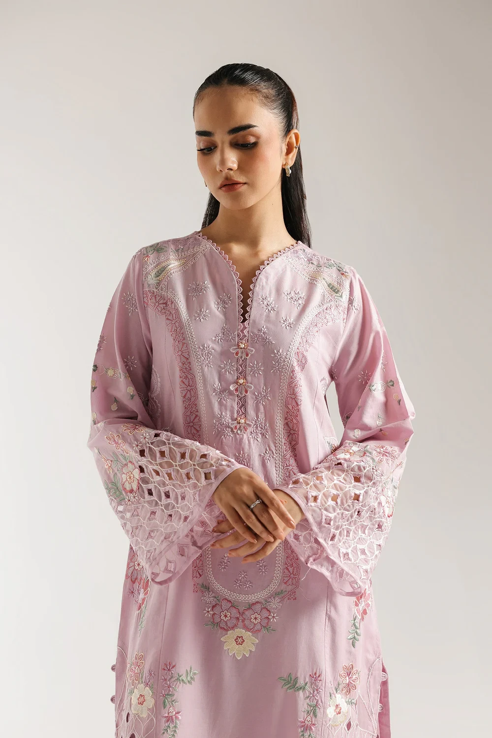 Step into a realm of intricate beauty with this enchanting lavender embroidered ensemble. The delicate lavender shirt features a rounded v neckline, beautifully adorned with floral embroidery in matching hues. The full-length sleeves are a highlight, showcasing stunning cutwork detailing at the border. The shirt's body and hem are further embellished with coordinating floral embroidery and charming cutwork patterns, enhancing its sophisticated appeal. Paired with perfectly tailored straight trousers in a matching lavender, this ensemble creates a cohesive and visually stunning look. Perfect for festive celebrations, elegant gatherings, or any occasion where you desire to exude graceful charm and artistic flair.
