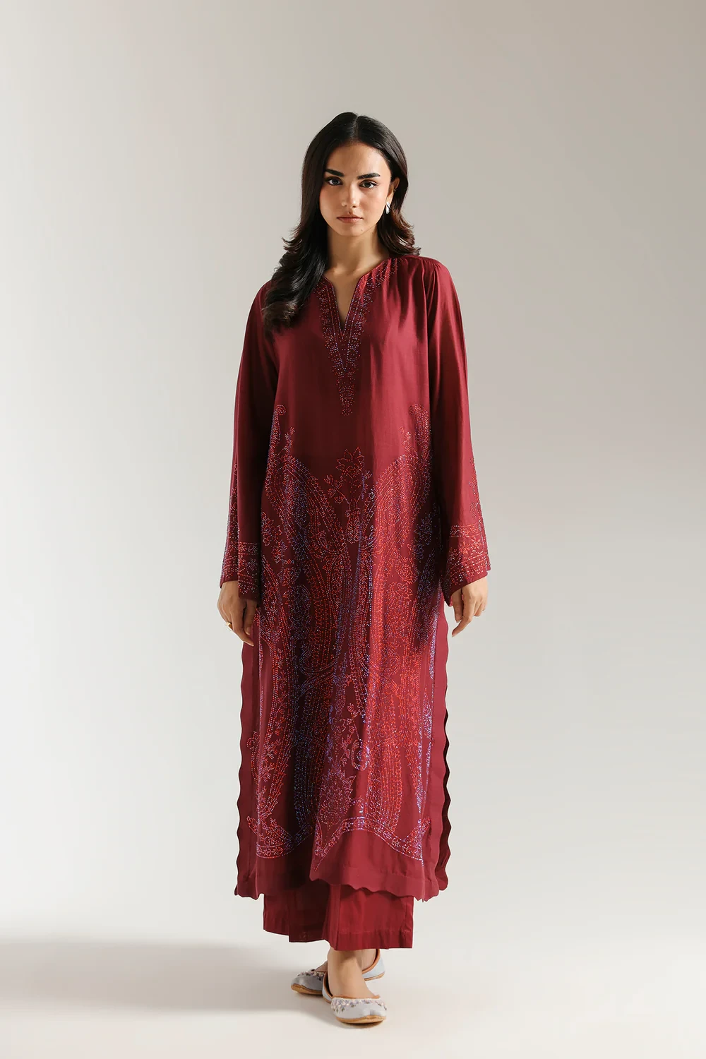 Discover a look of sheer elegance with this captivating embellished suit. The luxurious plum kurta features stunning, tone-on-tone embellishments in an intricate paisley pattern, giving the entire piece a rich and sophisticated texture. It is perfectly complemented by a matching trouser, making this a truly refined and timeless ensemble.