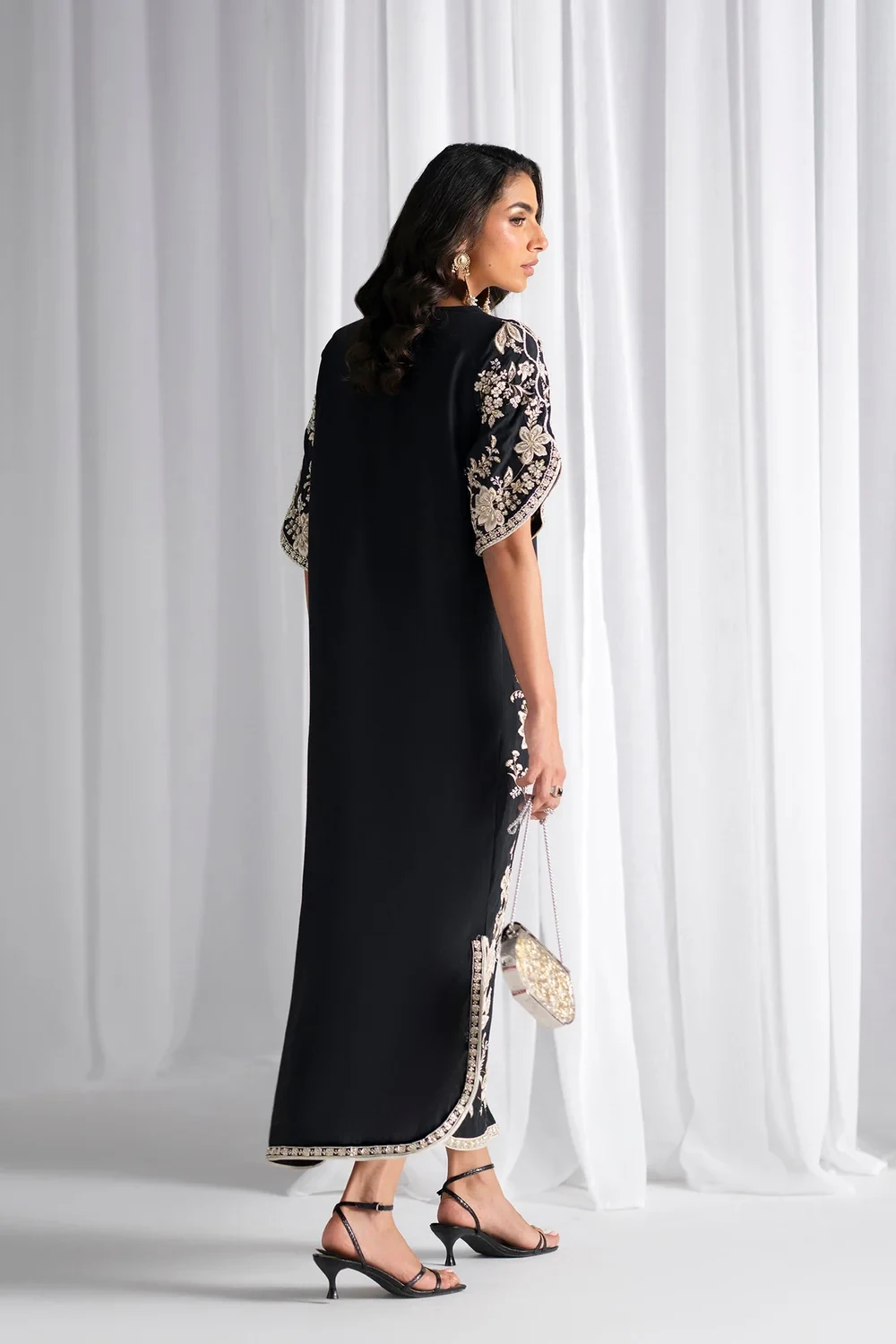 This exquisite embroidered kaftan features a strategically lined torso with ethereal sheer sleeves, balancing structure and fluidity. Masterfully executed traditional embroidery in soft pink and bronze metallic threads adorns the front placket, neckline, and full-length sleeves, creating an intricate tapestry of patterns. The hemline showcases a meticulously crafted banded border, while the relaxed silhouette drapes elegantly to mid-thigh. Designed as part of a complete three-piece ensemble with coordinating shalwar and dupatta, this kaftan represents timeless craft.