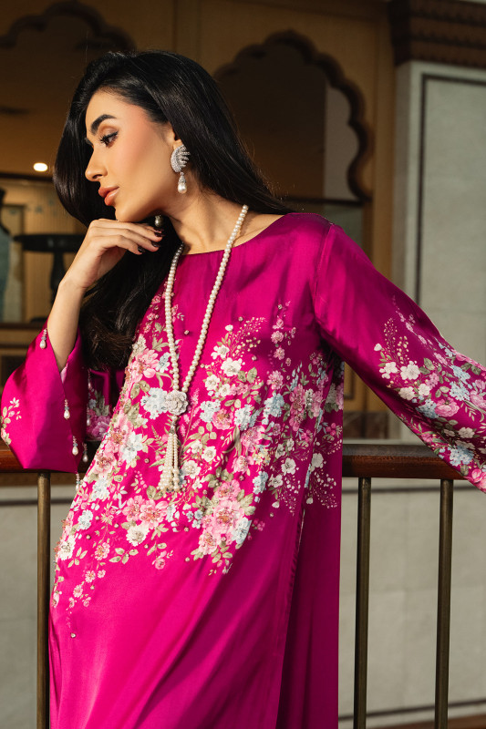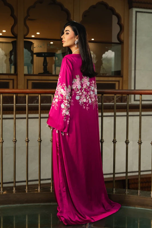 This fushia pink charmeuse silk dress is adorned with printed spring florals embellished with multicolored crystals amd pearls. With tassled flared sleeves, this dress is a statement. Pair with "Ashal Dupatta" to complete the look.