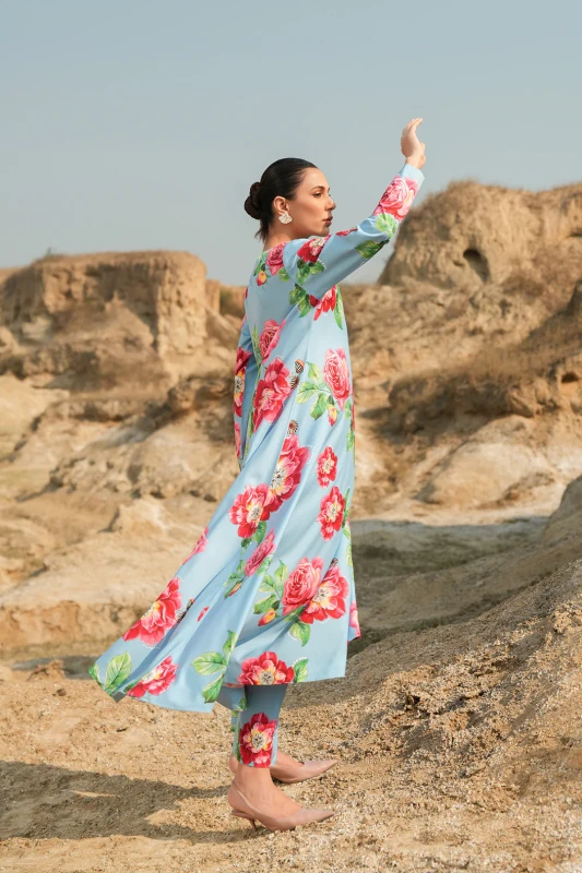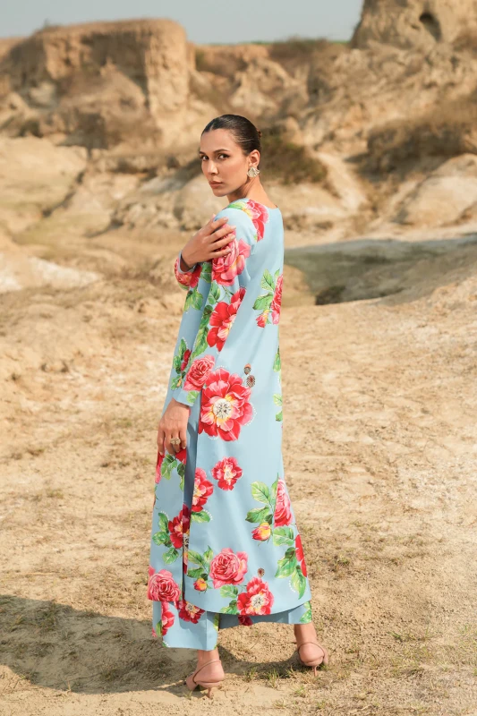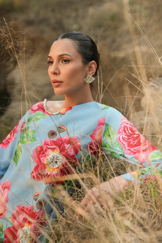 • This top, made in soft crepe fabric, in floral print, features boat neckline with pearl detail along one side of the neckline, full length sleeves, flared hem and side slit on one side.