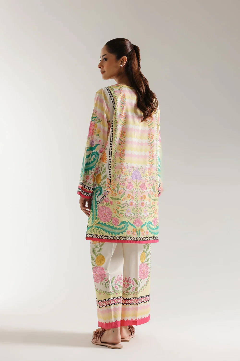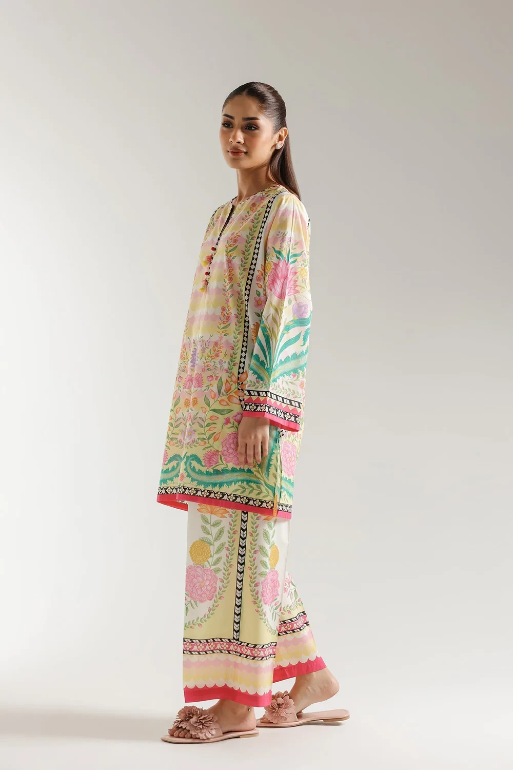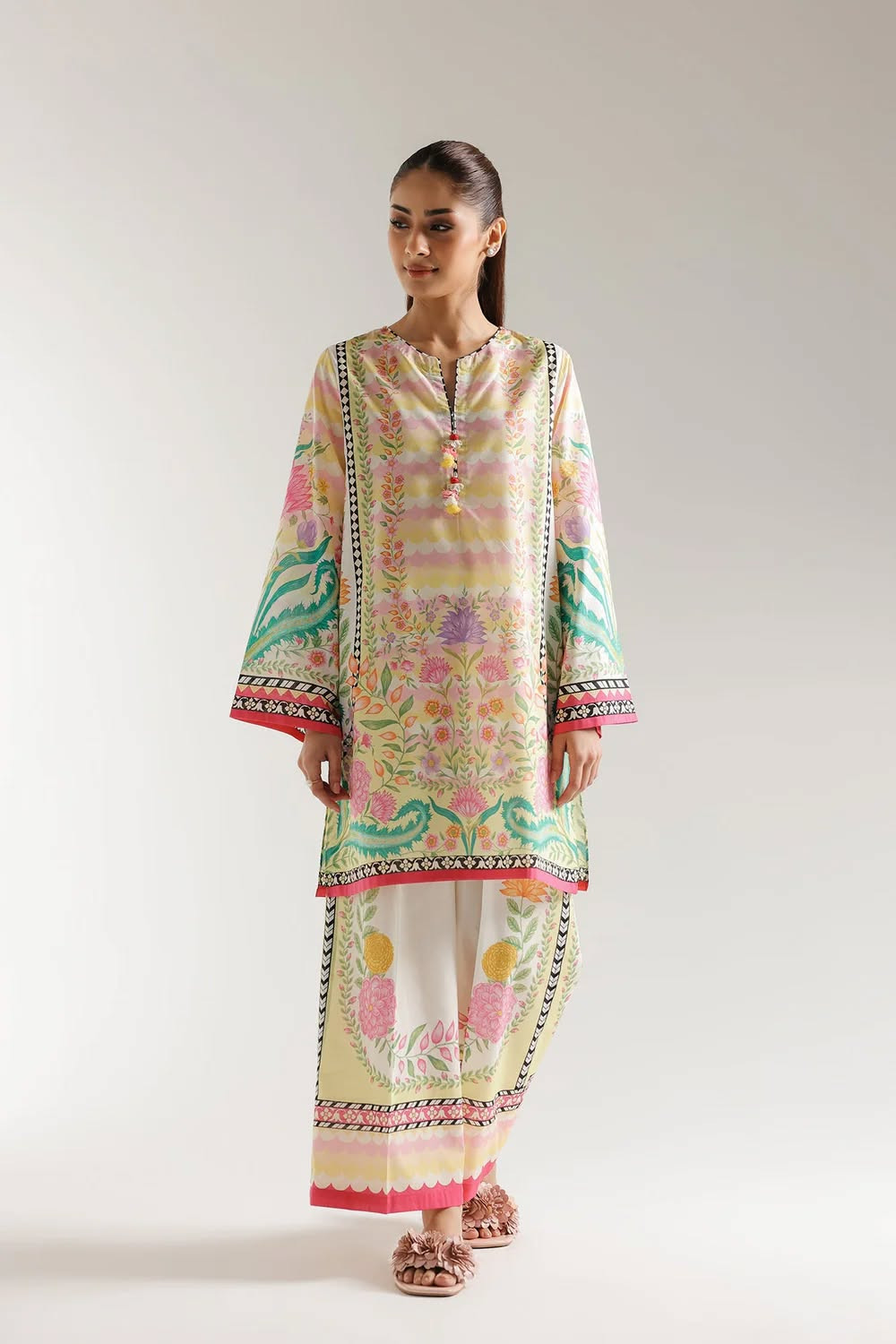 Step into a garden of style with this delicate pastel printed ensemble. The shirt showcases a soft and enchanting print featuring watercolor-like floral motifs and subtle geometric patterns in hues of yellow, pink, green, and white, accented by a contrasting printed border along the sleeves and hem. The outfit is paired with a coordinating culotte trouser that features a matching printed border at the hem, creating a cohesive look. This ensemble offers a comfortable and airy silhouette, perfect for embracing the warm weather with a touch of feminine charm. Style it with delicate sandals or khussas to complete this effortlessly elegant outfit.