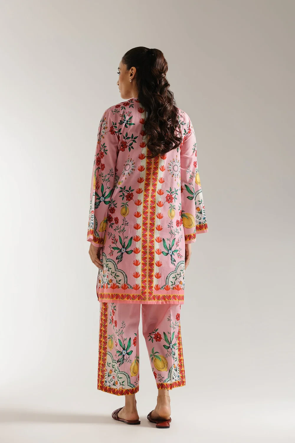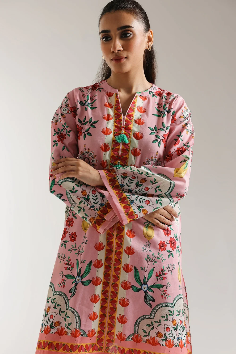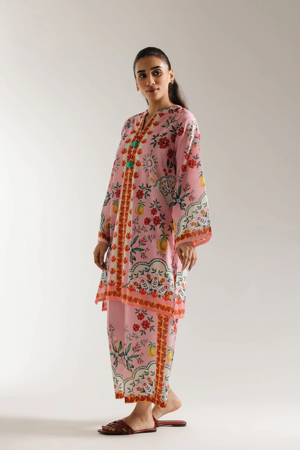 Embrace the vibrancy of spring with this delightful printed ensemble. The soft, blush-toned fabric of the long, straight-cut shirt is adorned with a charming array of botanical motifs, featuring delicate florals and whimsical fruit patterns in hues of red, green, and cream. The intricate border detailing along the neckline, placket, cuffs, and hem adds a touch of refined artistry, while the playful tassels at the neckline introduce a hint of bohemian flair. The coordinating straight-cut trousers continue the cheerful print, creating a harmonious and effortlessly stylish look. The comfortable silhouette and eye-catching design make this outfit perfect for both relaxed daytime outings and more festive occasions.