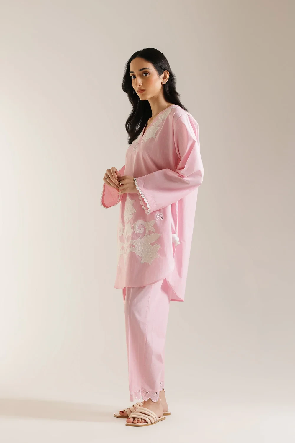 Step into gentle elegance with this charming two-piece ensemble, a vision in soft pink adorned with delicate white embroidery. The graceful pink kurta is beautifully enhanced with intricate white floral and vine embroidery, elegantly tracing the V-neckline and adorning the front and sleeves. It is perfectly complemented by matching straight-cut trousers, also featuring subtle embroidery at the cuffs, creating a cohesive and polished silhouette. This outfit is ideal for smart casual events, festive gatherings, or adding a distinctive and graceful statement to your style.