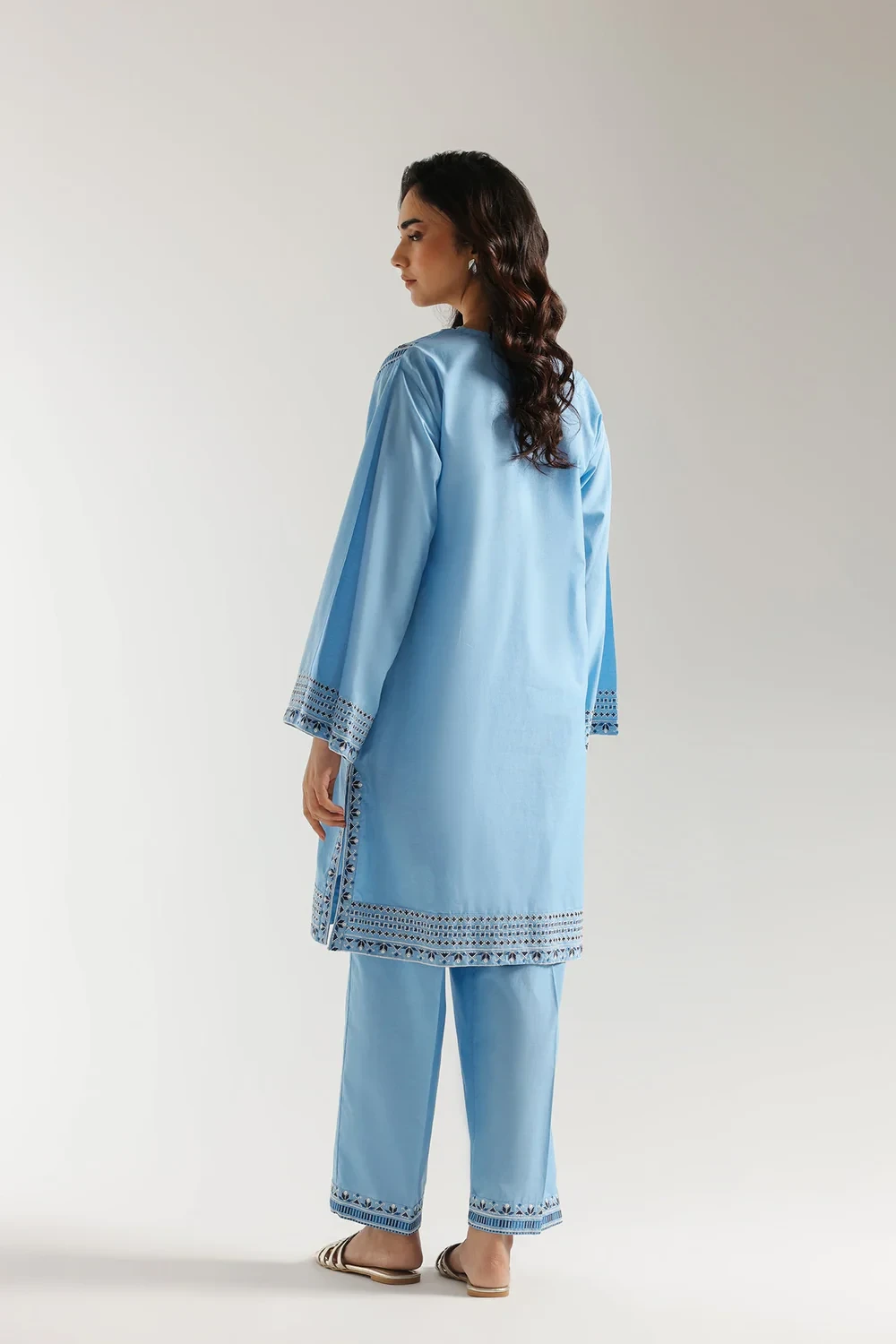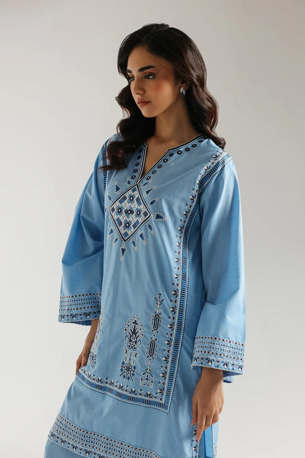 Step into a serene symphony of style with this captivating aqua blue embroidered ensemble, a harmonious blend of traditional charm and contemporary elegance. The calming aqua blue tunic serves as a graceful canvas, intricately adorned with detailed white and black geometric and floral embroidery that beautifully frames the V-neckline and cascades elegantly down the front panel. The full-length sleeves are finished with complementing embroidered borders, enhancing the tunic's sophisticated silhouette. Paired with perfectly matching straight trousers, this ensemble creates a cohesive and visually stunning look. Perfect for daytime gatherings, festive celebrations, or simply when you desire to exude understated grace and artistic flair.