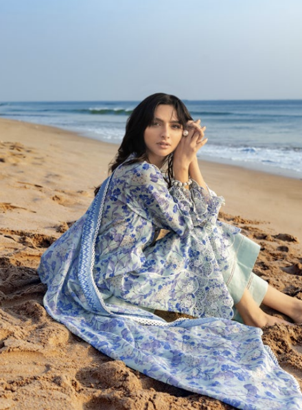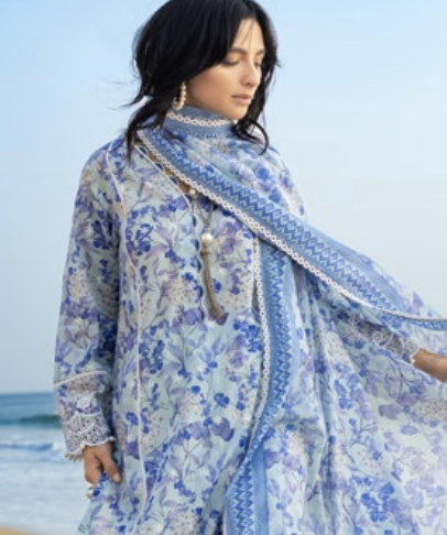 Embroidered Printed Denting Lawn Dupatta. Schiffli Embroidered Printed Lawn Shirt Front & Sleeves With Printed Lawn Back. Dyed Trouser.