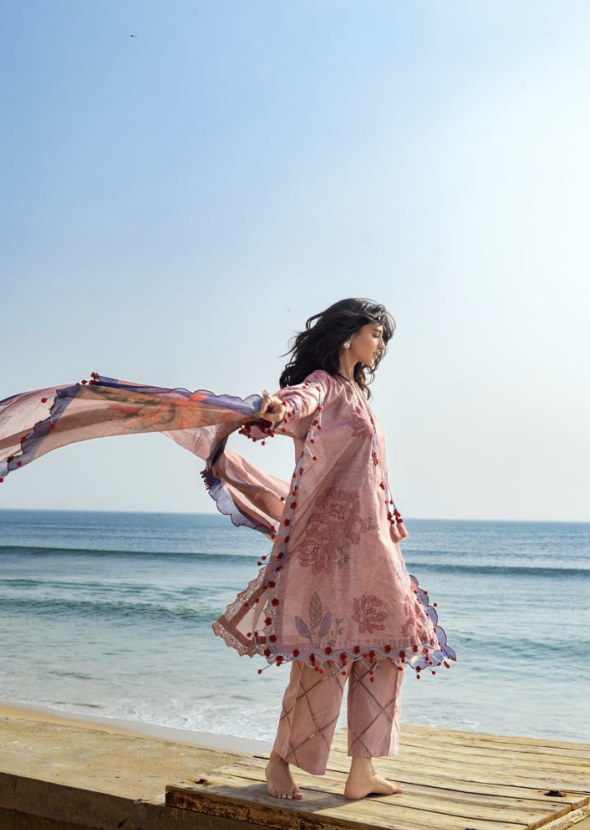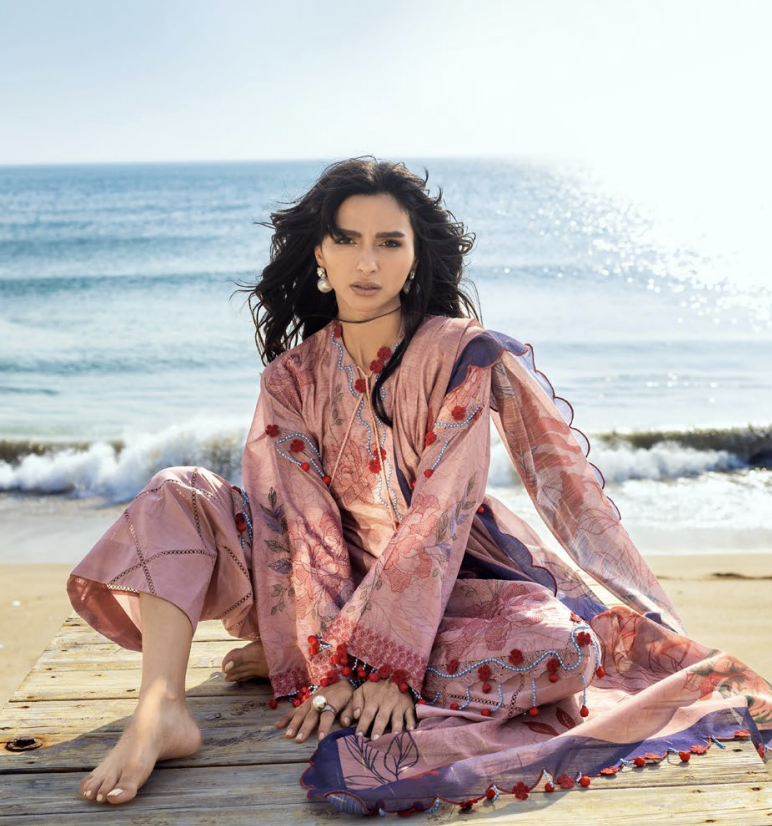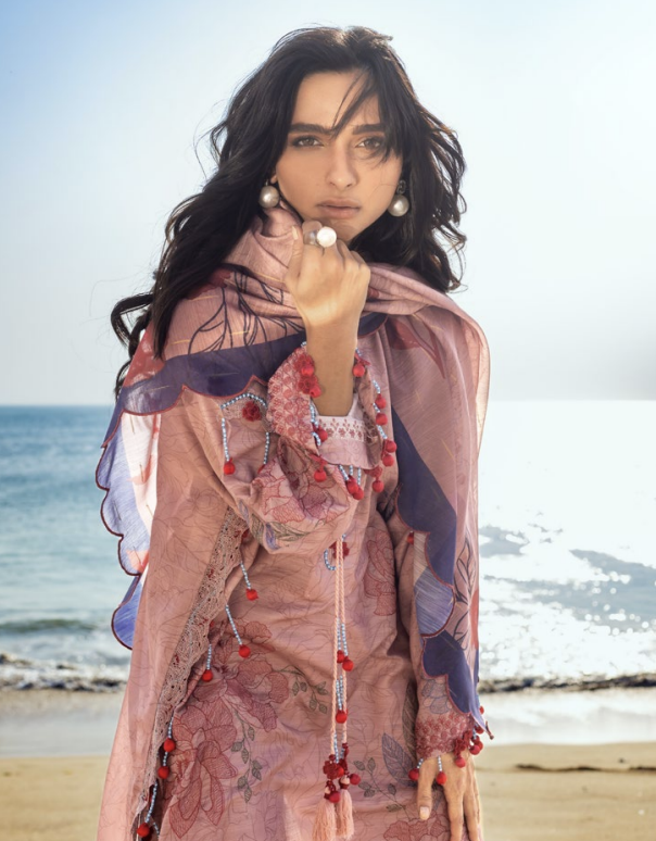 Embroidered Printed Denting Lawn Dupatta. Schiffli Embroidered Printed Lawn Shirt Front & Sleeves With Printed Lawn Back. Dyed Trouser.