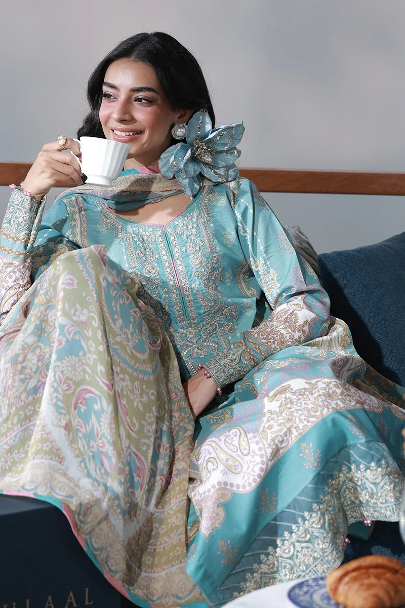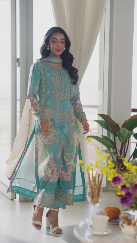 Step into effortless summer elegance with this light pastel blue lawn ensemble, crafted for comfort and refined everyday wear. The printed lawn shirt is elevated with an embroidered organza neckline, complemented by a delicately embroidered shirt border and embroidered organza sleeve borders that add a touch of sophistication. Paired with printed cotton trousers and finished with a flowing chiffon dupatta, this design blends breathable fabrics with thoughtful detailing-perfect for polished yet easy summer dressing.