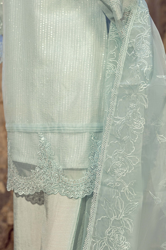 Dupatta: A graceful organza dupatta, adorned with elegant embroidery and finished with 4-side lace detailing.