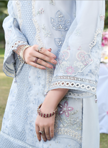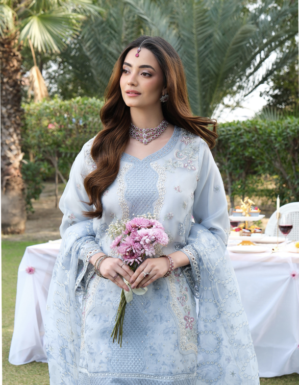 Meesa is a timeless organza ensemble designed with refined embroidery, subtle prints, and graceful detailing for elegant festive wear.