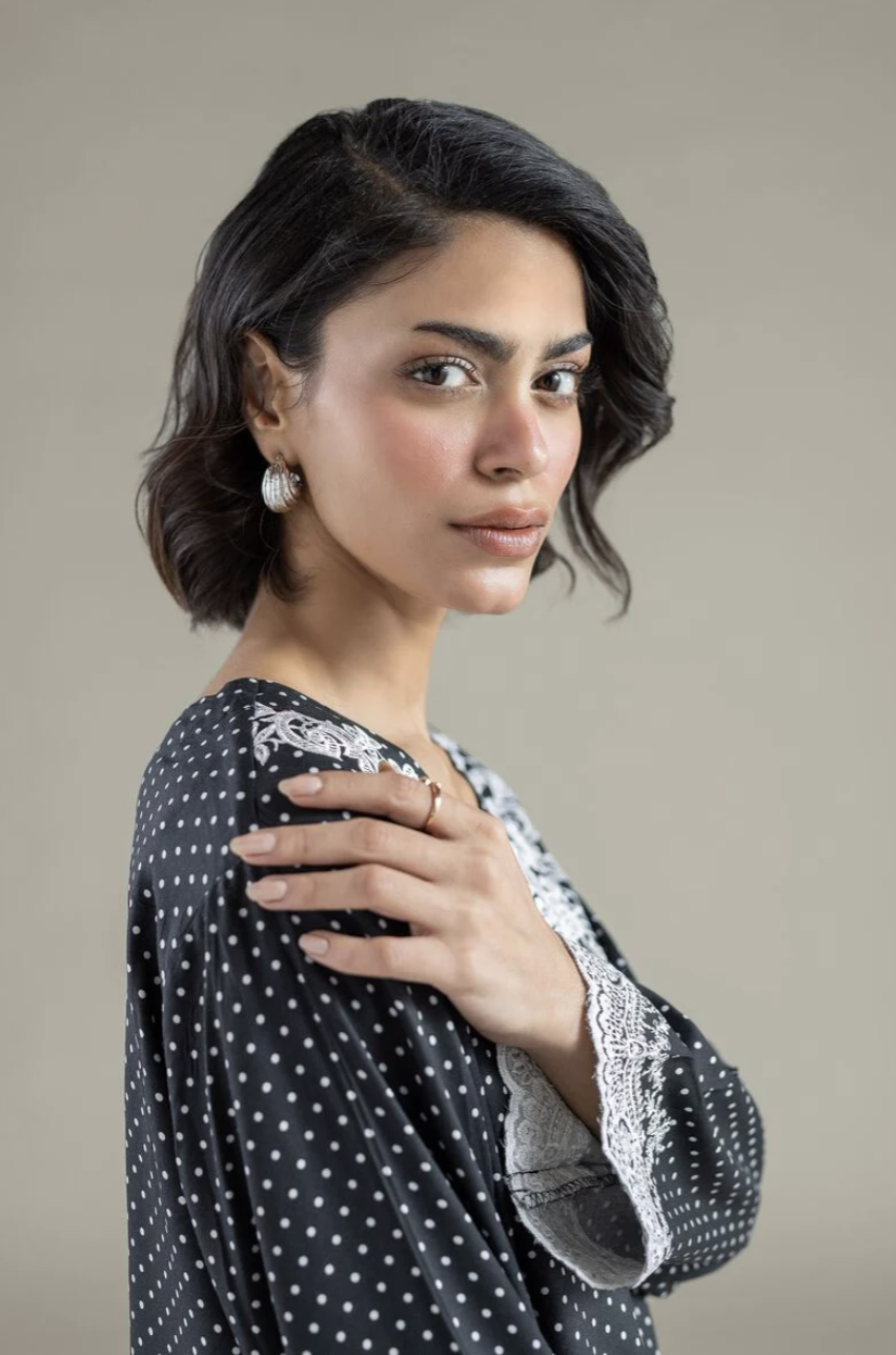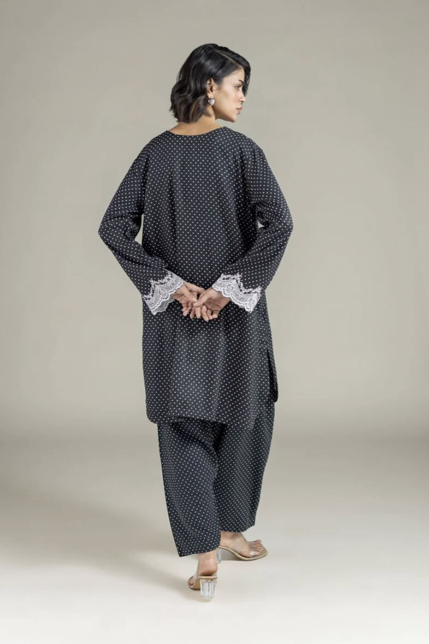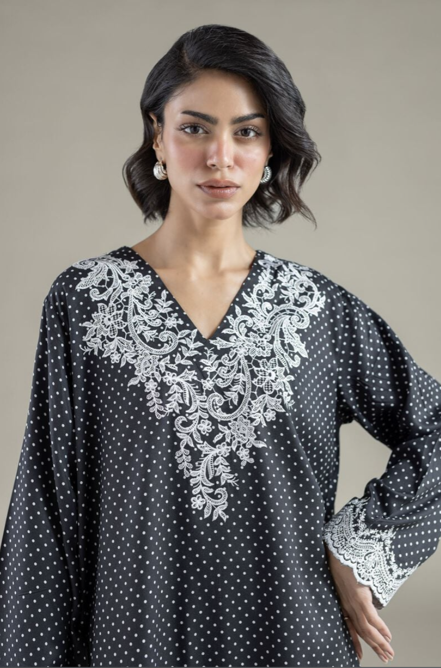 • Description: Black marina kurta in a dotted print with a V-neckline. Regular fit, full straight sleeves, featuring thread work, embroidery, and a rounded hem.