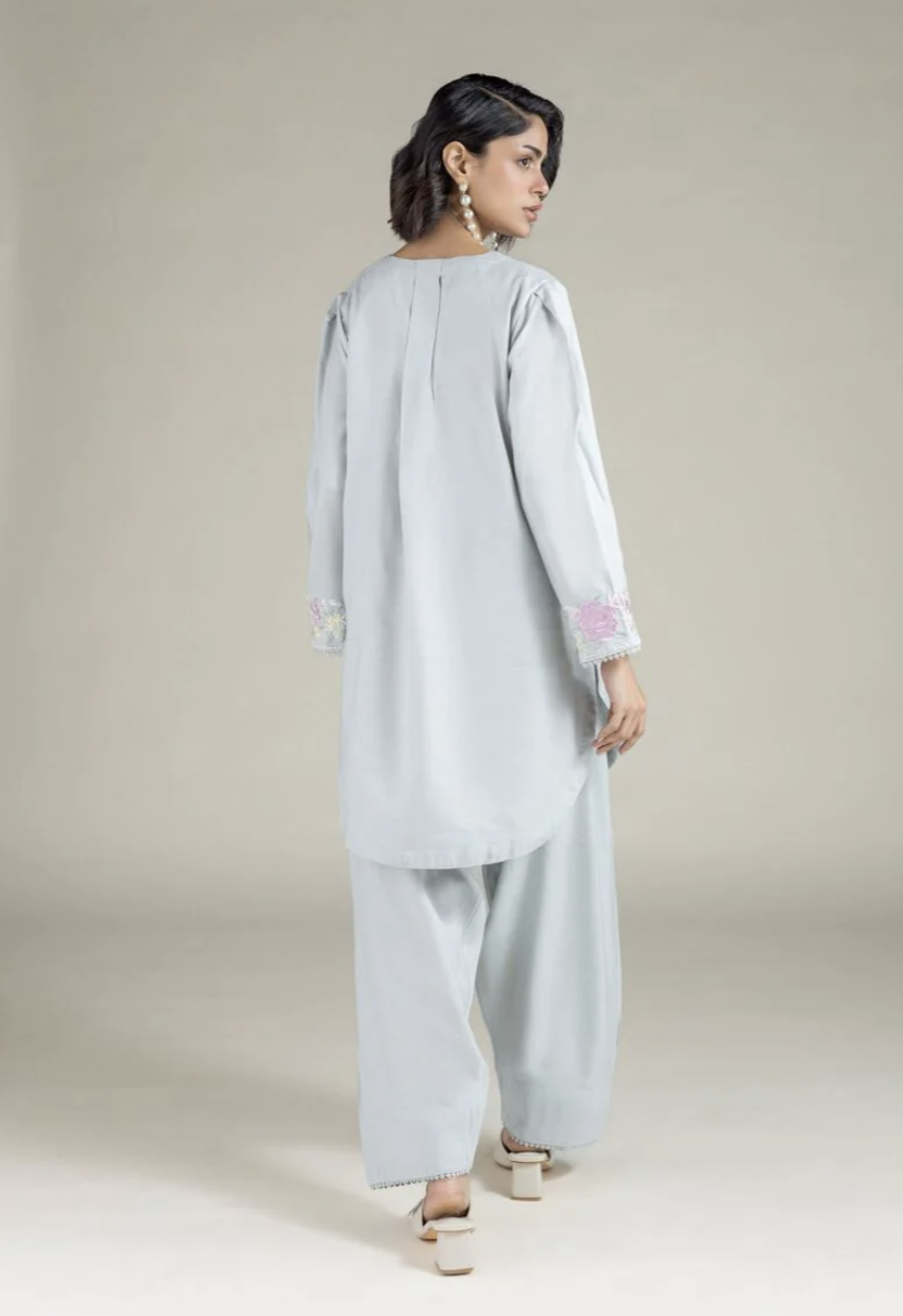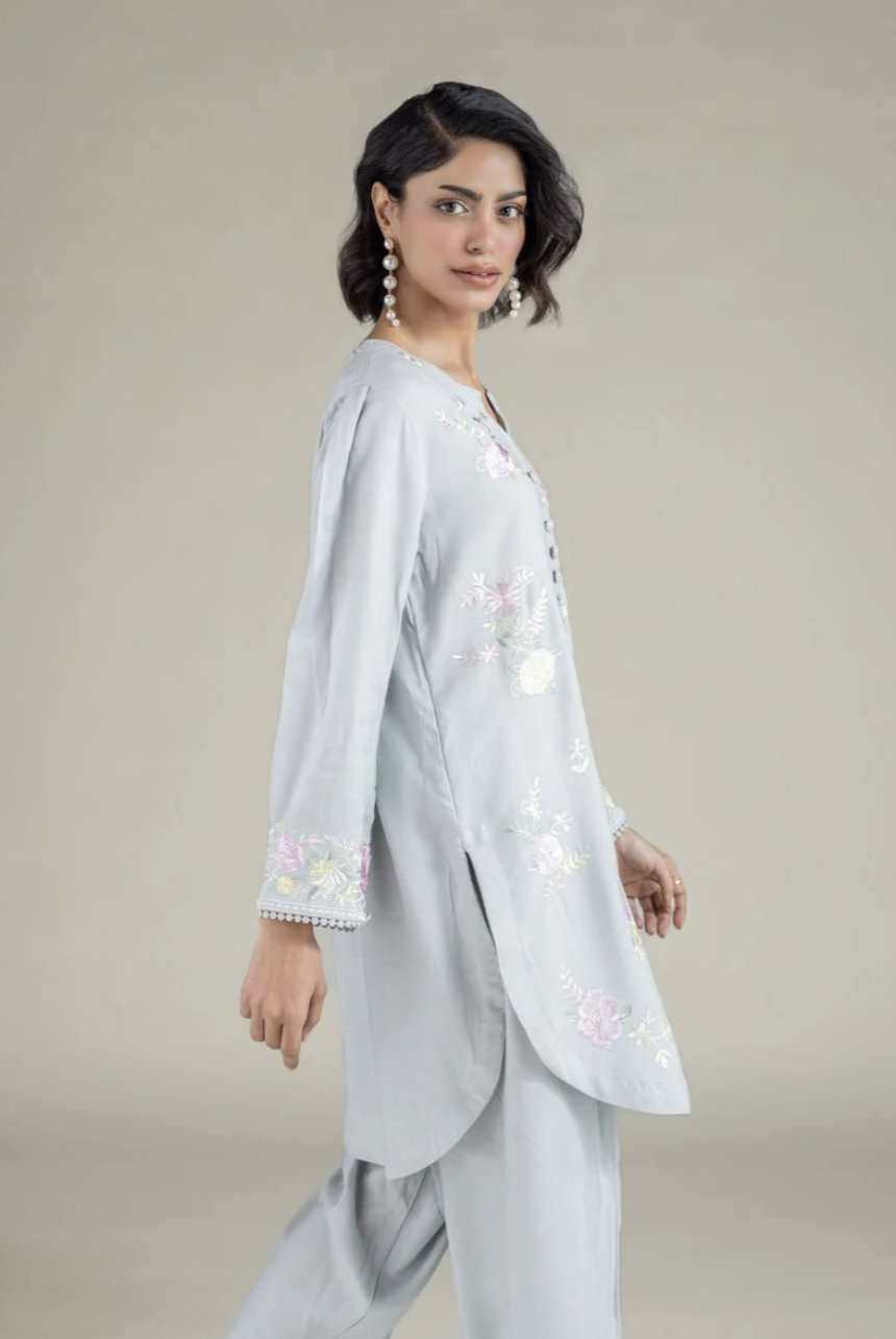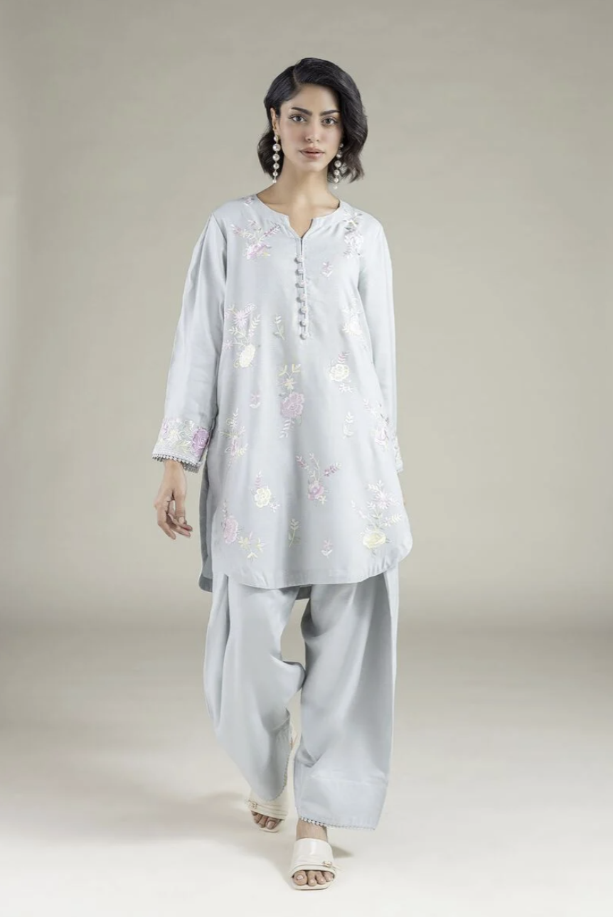 • Description: Light blue floral kurta features full straight sleeves and a round V-neckline. Heavy blended viscose fabric with dyed embroidery and button details.
