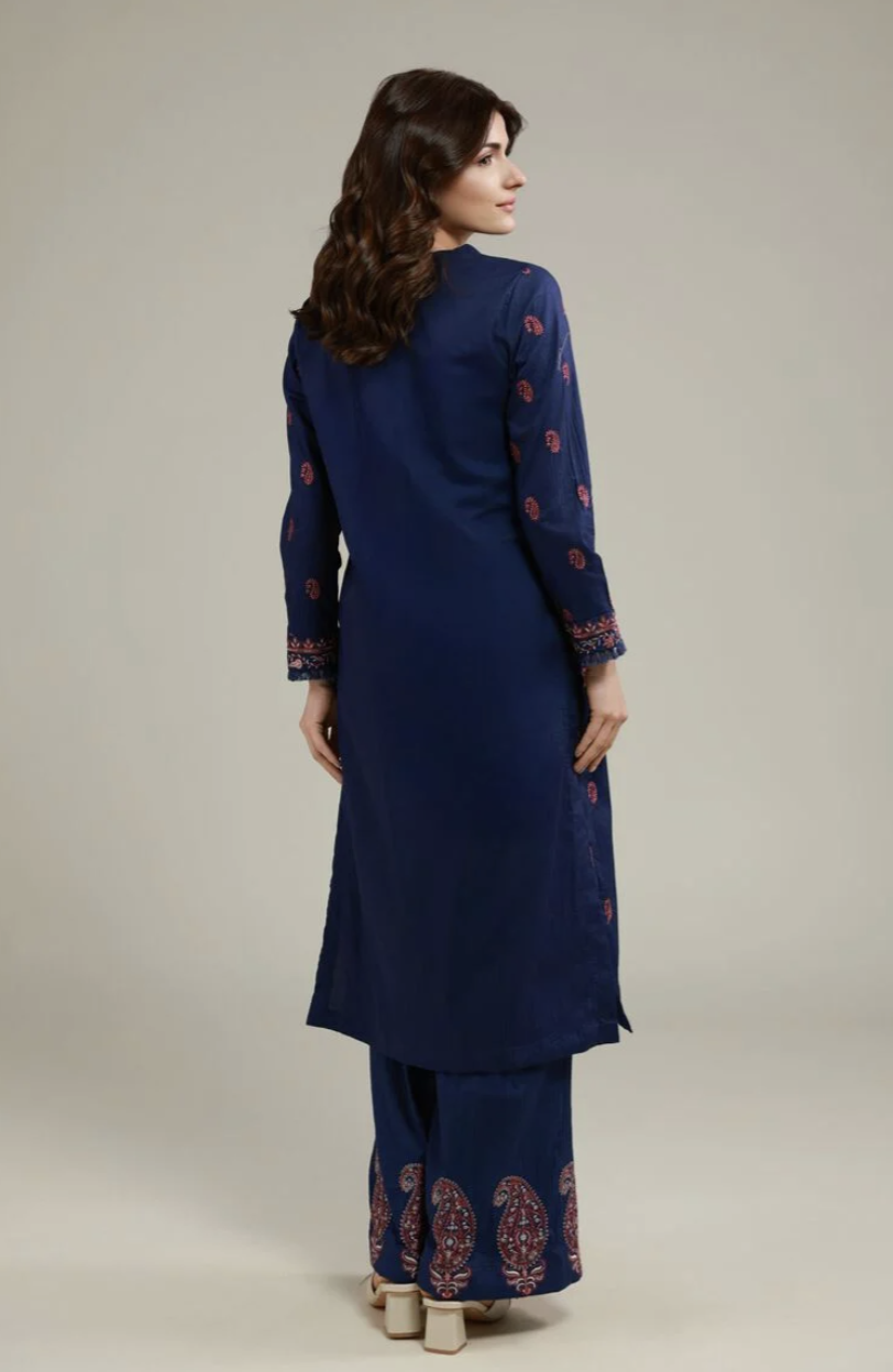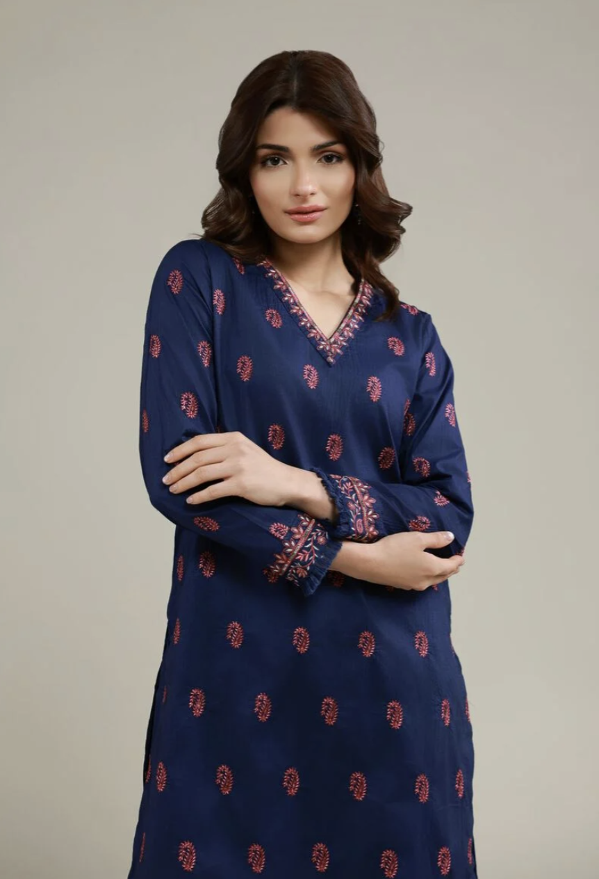 • Description: Paisley pattern, navy blue cotton crinkle kurta features a V-neck and full straight sleeves. Smart fit with dyed embroidered thread work.