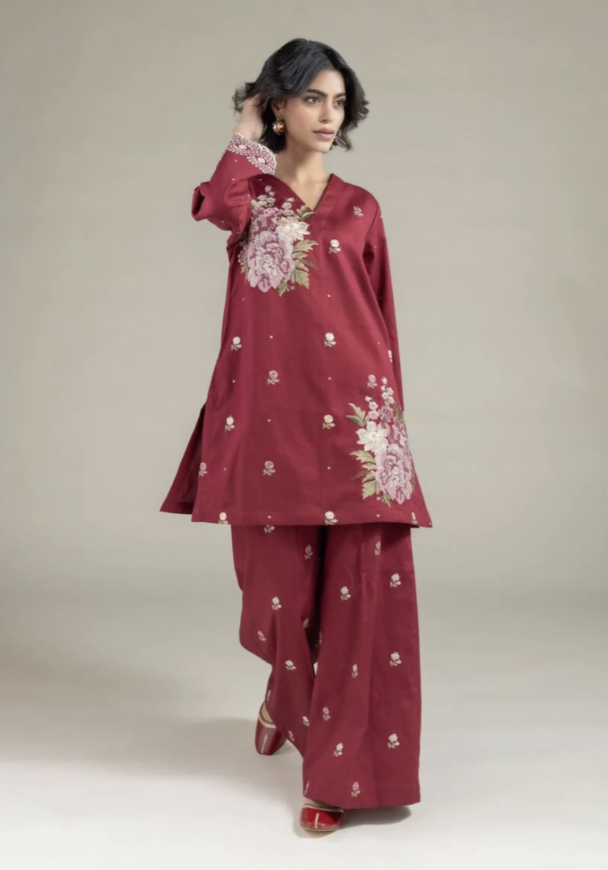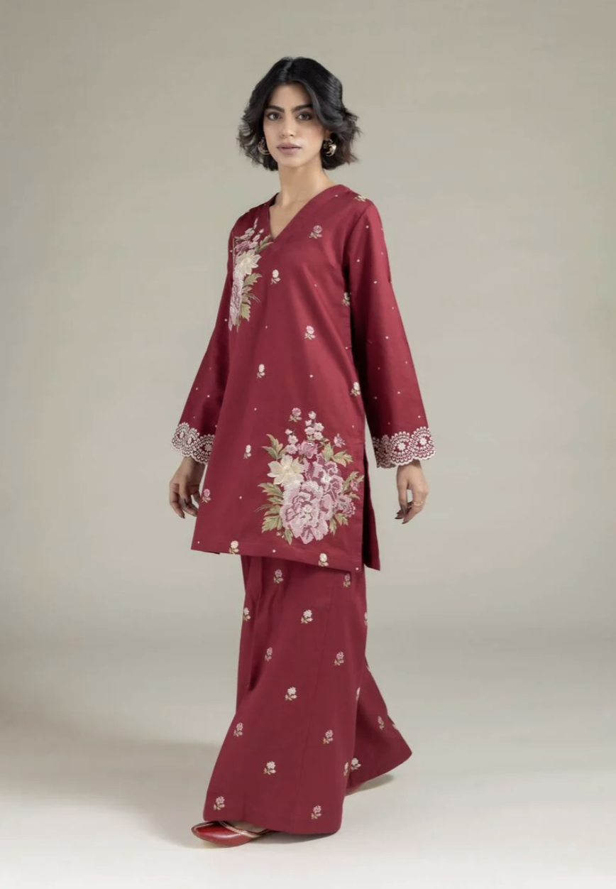 • Description: A short floral embroidered kurta featuring full sleeves with a scalloped design, and a neckline with a V-cut.