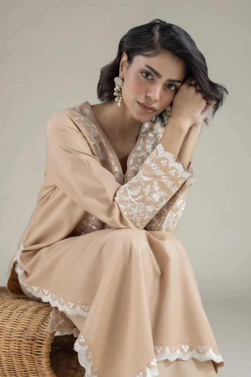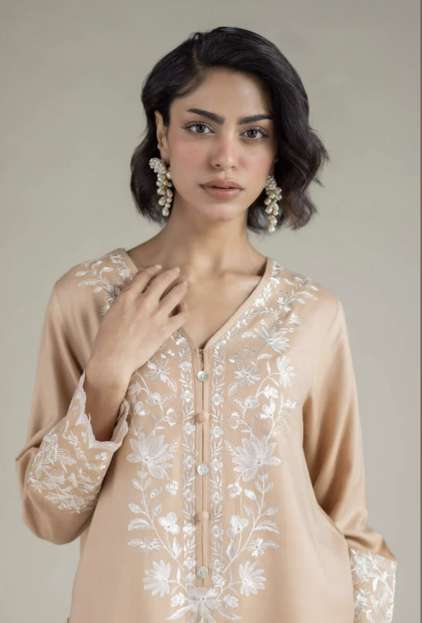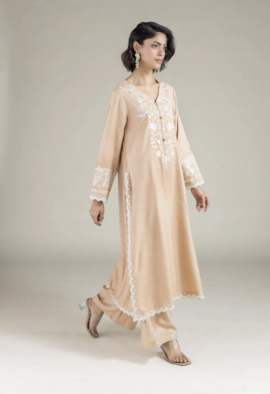 • Description: V-neck kurta features a beige floral design and thread-work embroidery. Regular fit longline with straight full sleeves and buttons, scalloped hem.