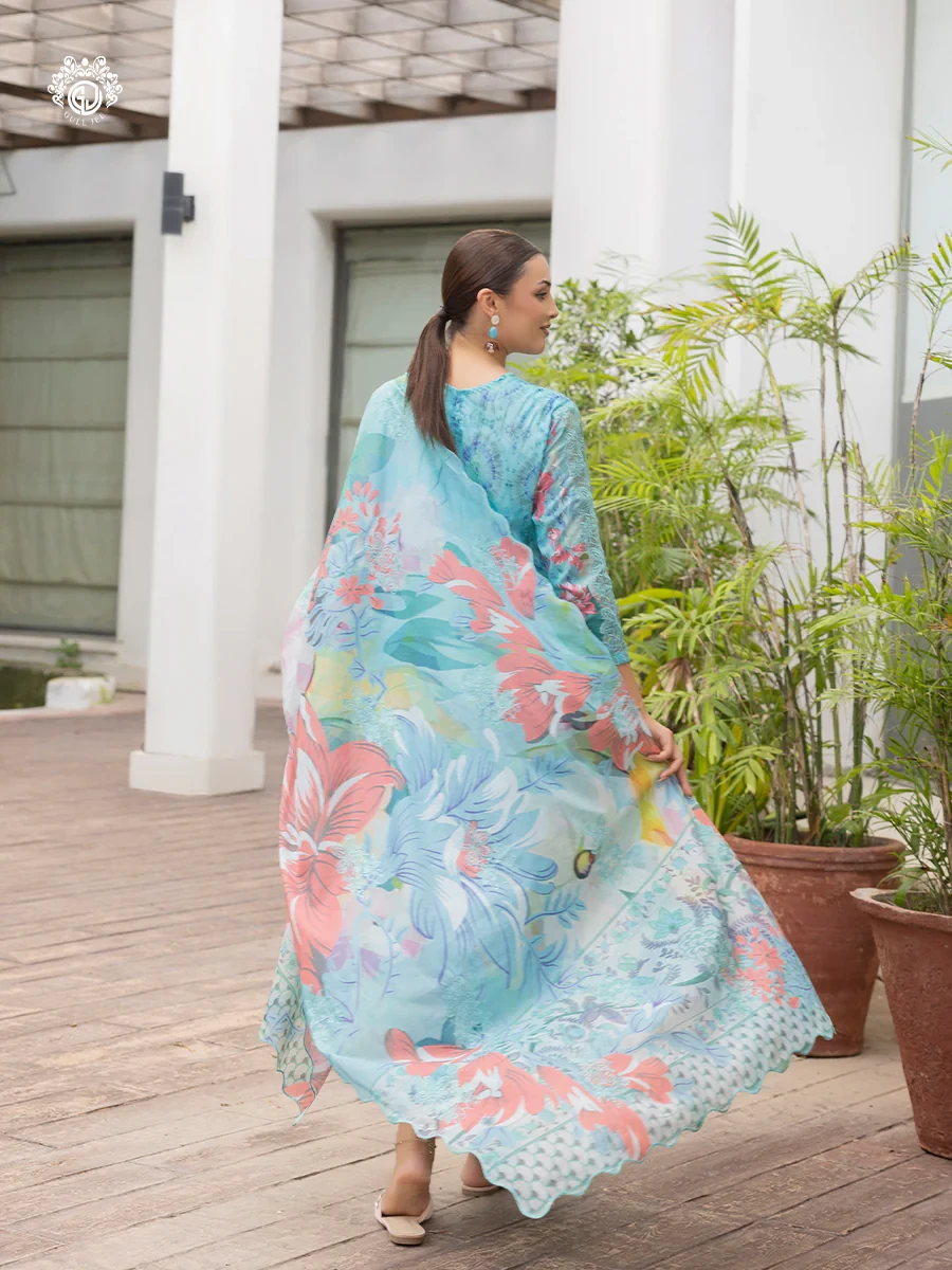 Elevate your style with this beautifully crafted three-piece suit featuring digital prints and intricate organza embroidery — perfect for any occasion.