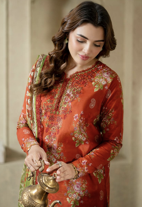 Digital printed lawn neck embroidered shirt.