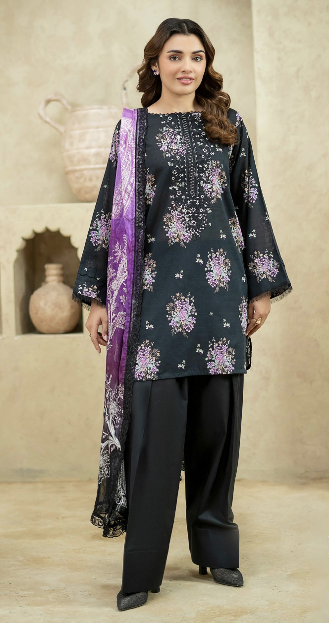 Digital printed Bamber Chiffon Dupatta with 4-sided embroidered lace.
