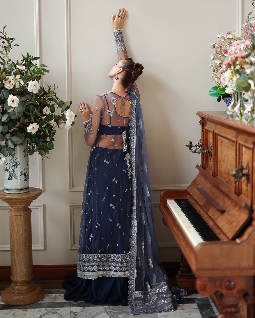 • Embroidered, sequined & hand embellished net front & side left, right panels