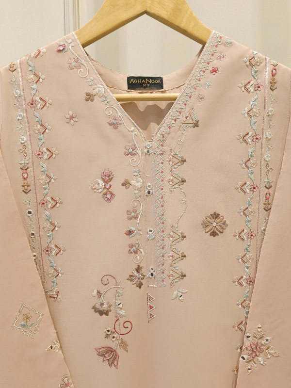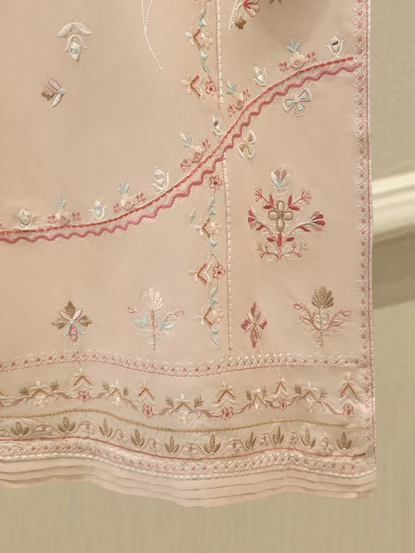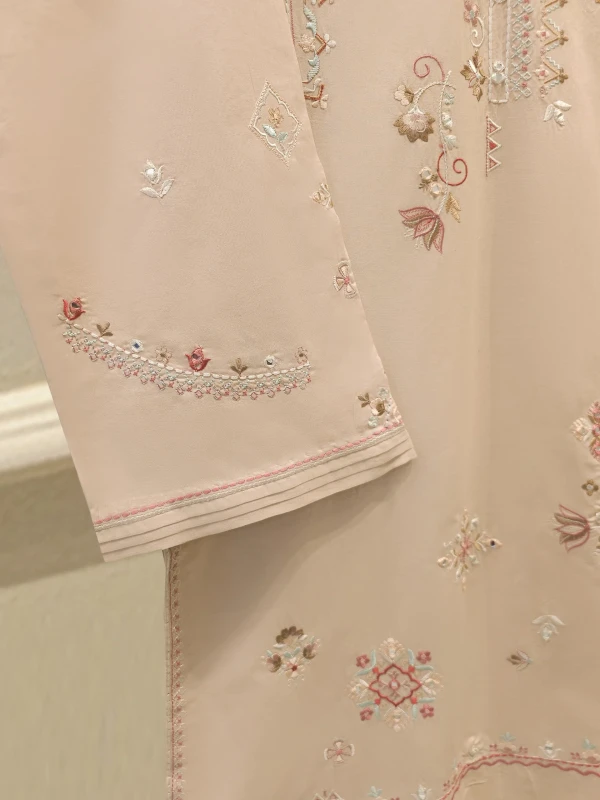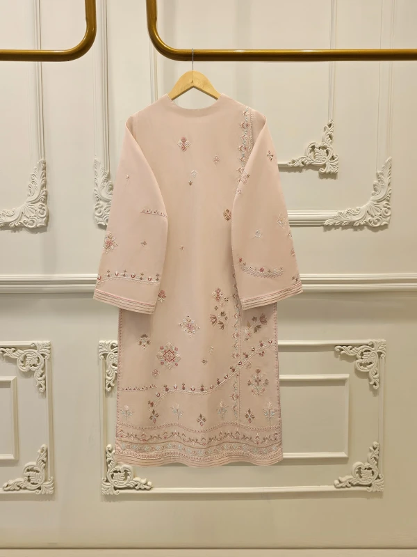Elevate your summer wardrobe with this beautifully crafted beige cambric shirt, featuring intricate Chikan Kari work on the sleeves and daman. Designed for timeless elegance, this piece blends breathable lawn fabric with traditional craftsmanship, perfect for festive occasions or casual sophistication. Pair it with pants for a complete look.