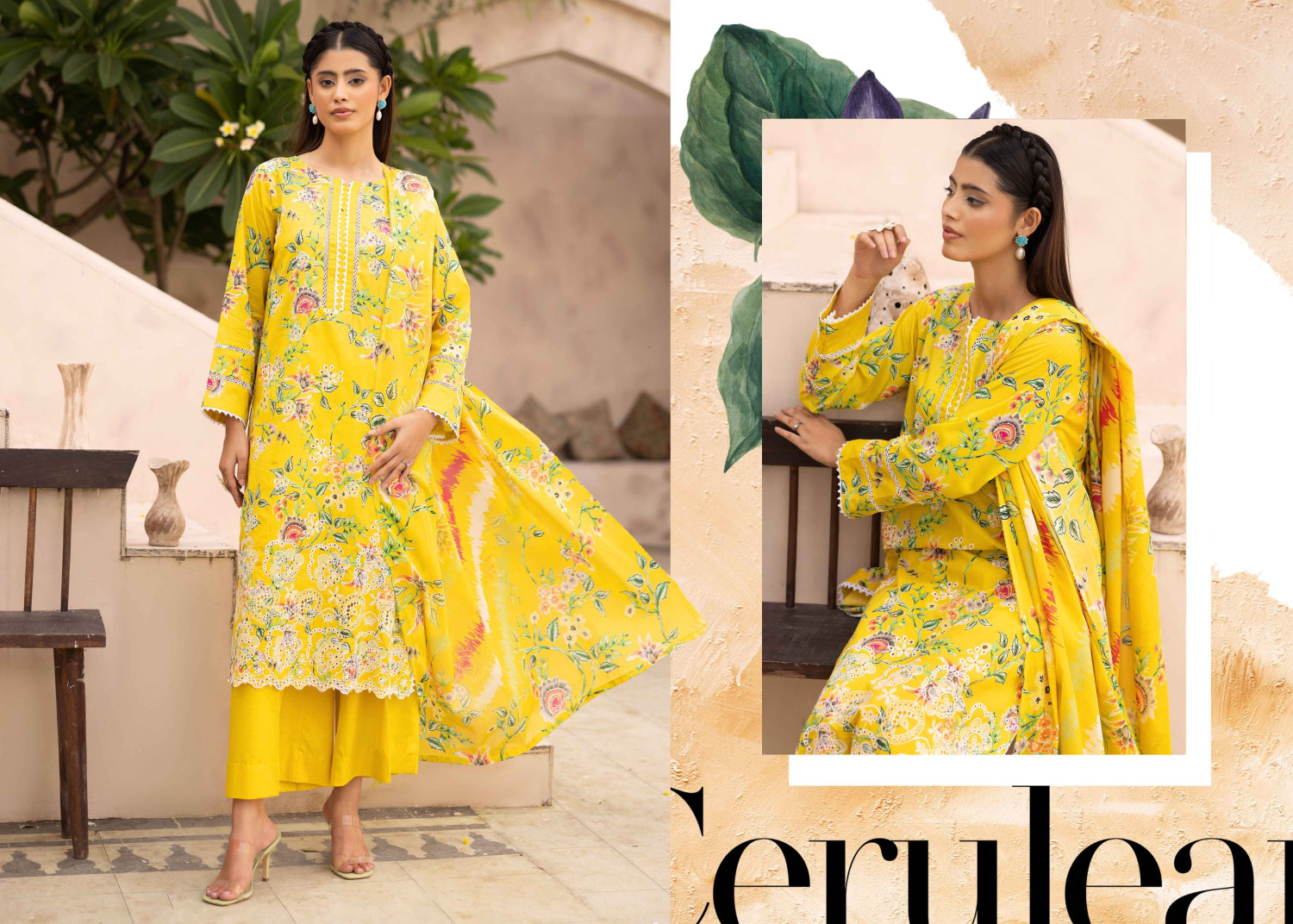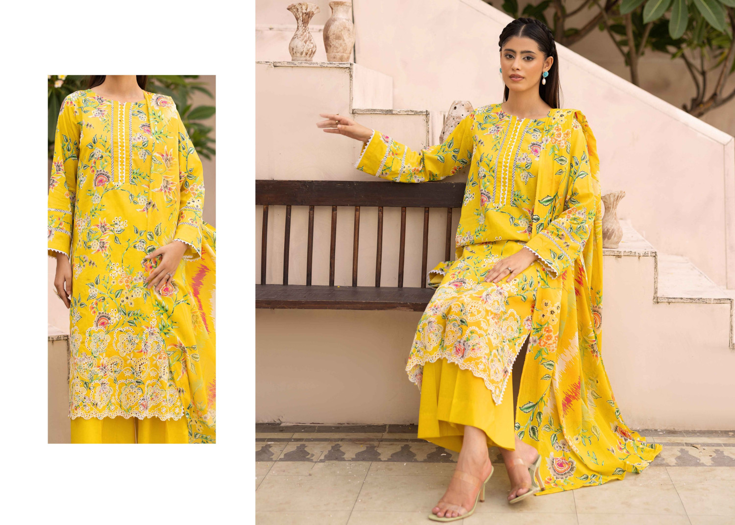 A refreshing three-piece lawn outfit featuring floral digital prints with delicate embroidery, designed for a stylish and elegant summer look.