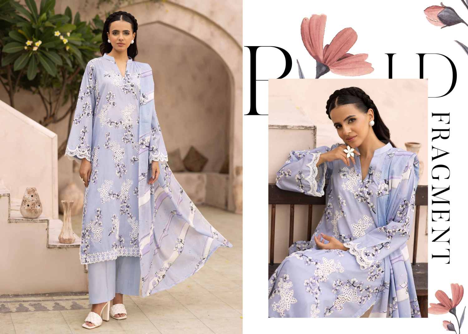 A refreshing three-piece lawn outfit featuring floral digital prints with delicate embroidery, designed for a stylish and elegant summer look.