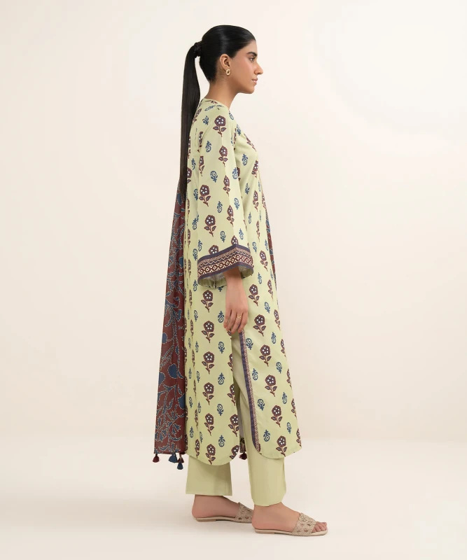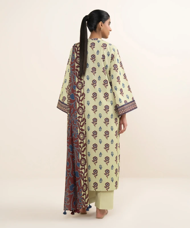 Make a statement with our three-piece printed off-white ensemble featuring a cotton shirt and trousers paired with a red and blue voile dupatta.