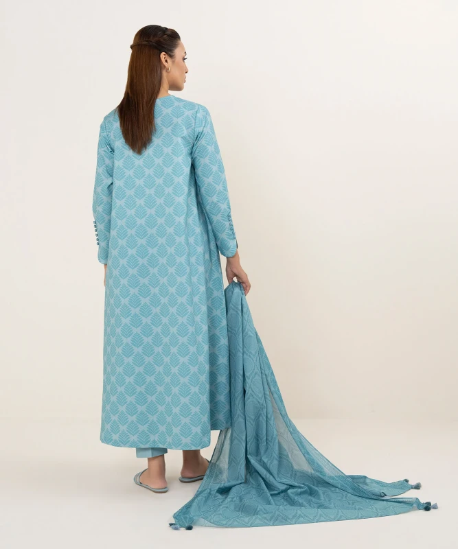 Make a statement with our three-piece printed light blue ensemble featuring a cotton shirt and trousers paired with a voile dupatta.