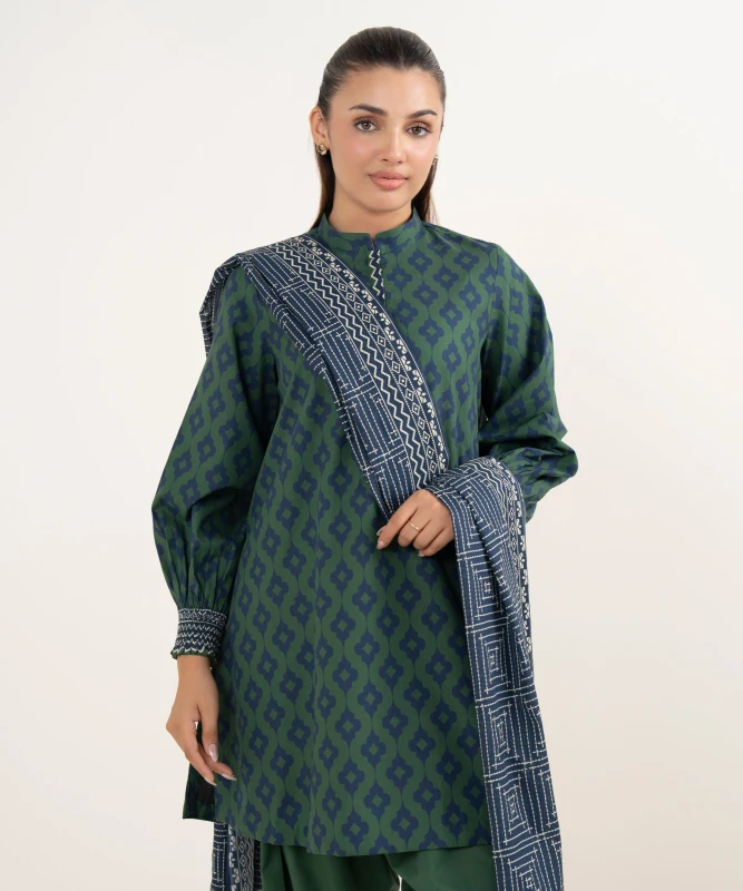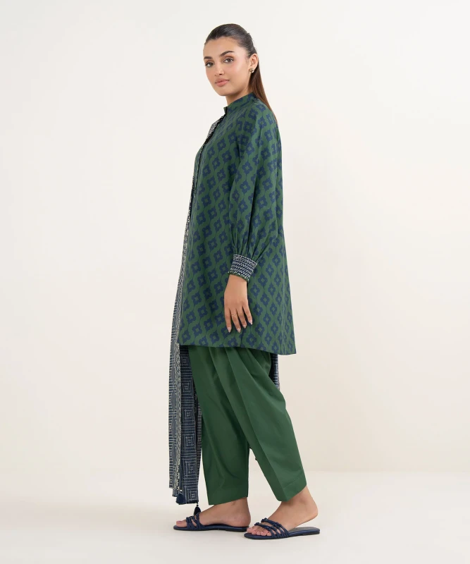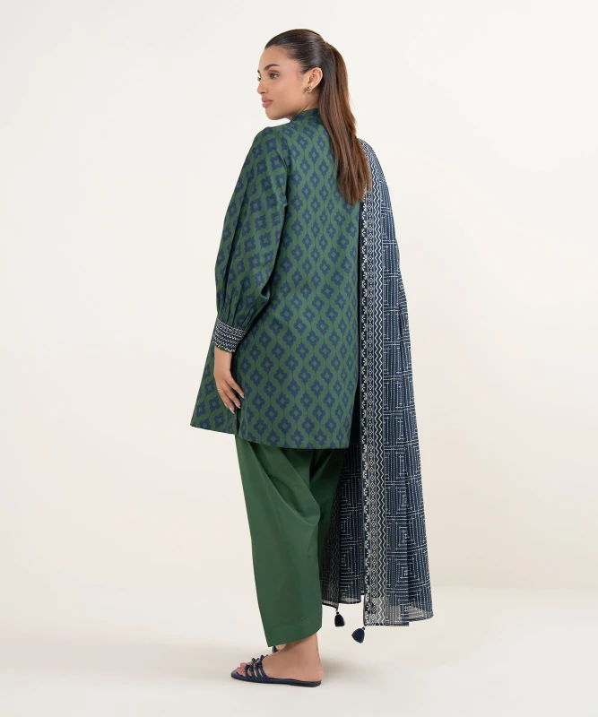 Make a statement with our three-piece green and blue ensemble featuring a cotton shirt and trousers paired with a textured voile dupatta.