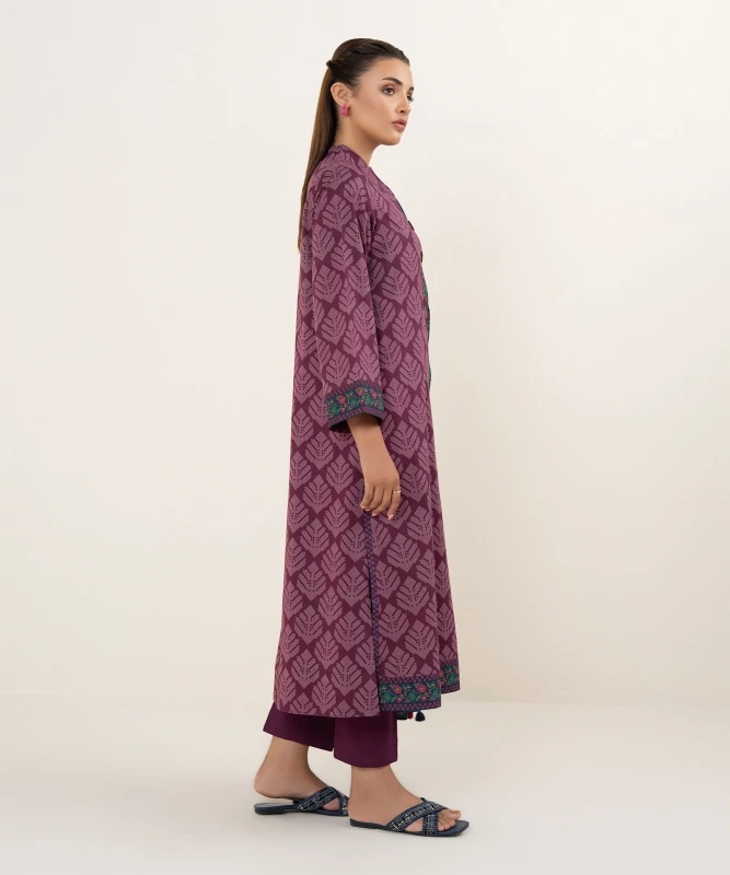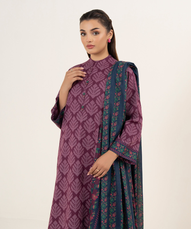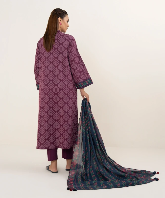 Make a statement with our three-piece printed maroon ensemble featuring a lawn shirt paired with cotton trousers and a voile dupatta.